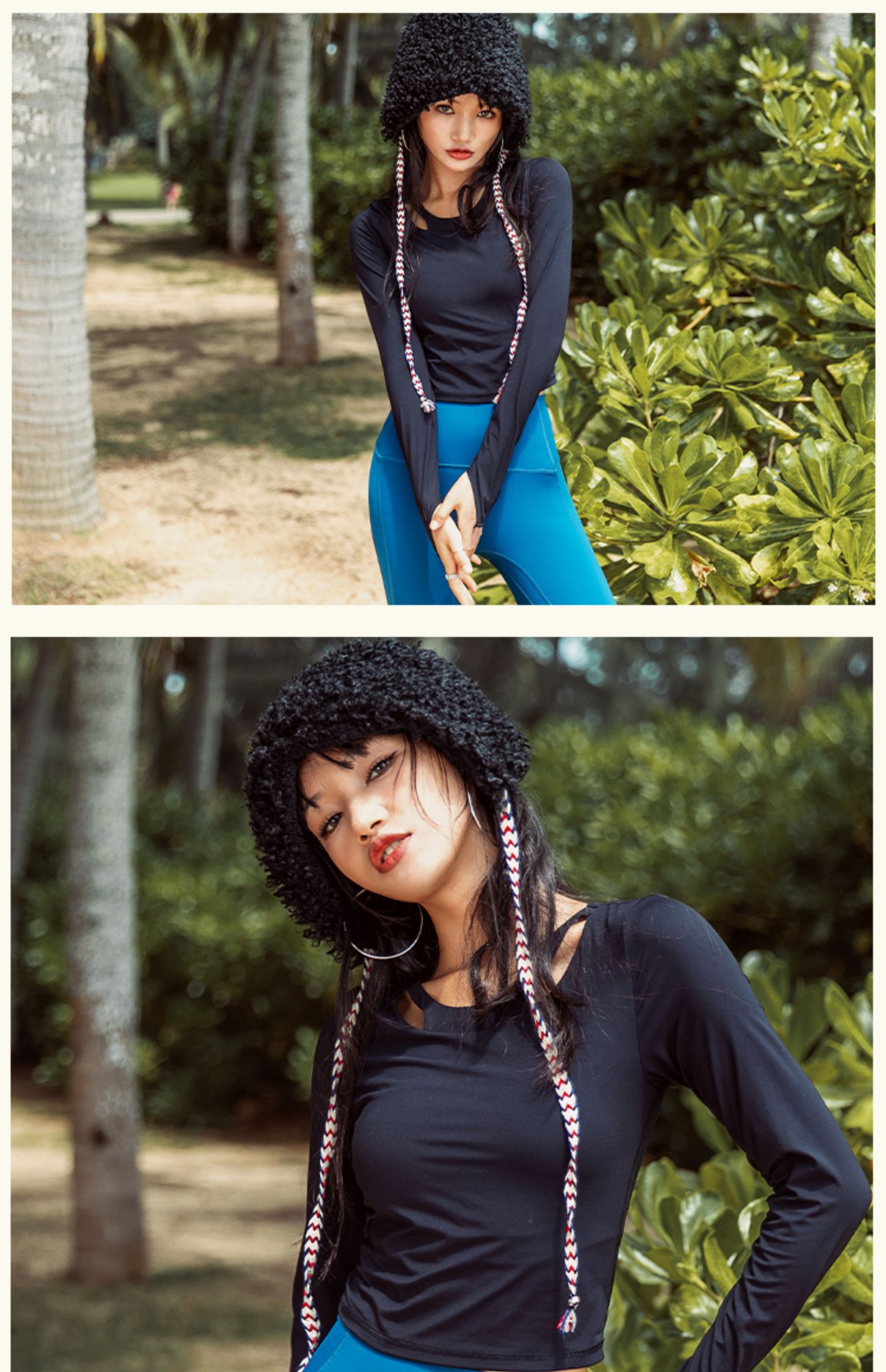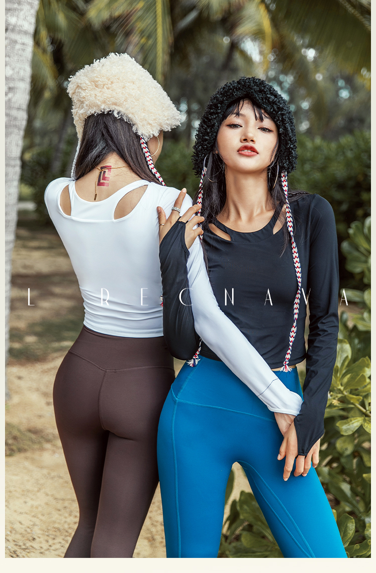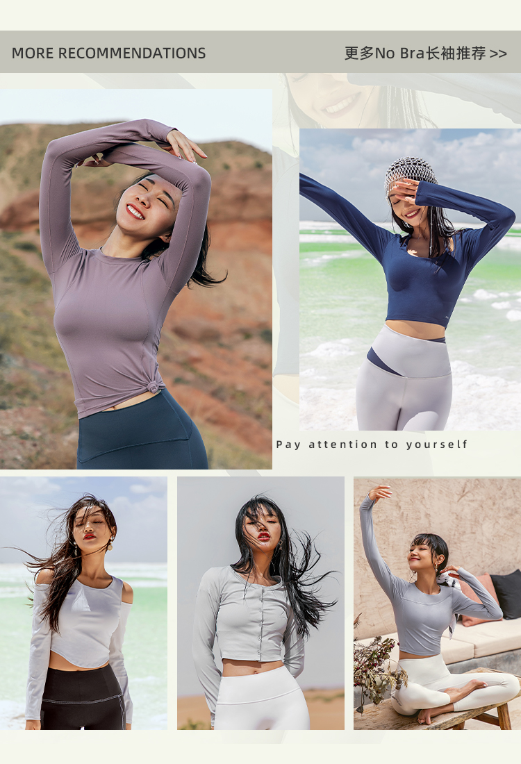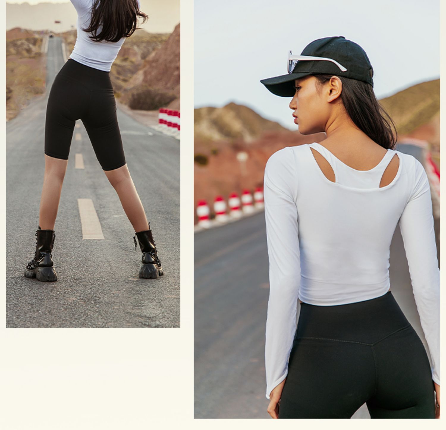 【裸感】法式红挂脖带胸垫长袖弹力紧身健身服女瑜伽服