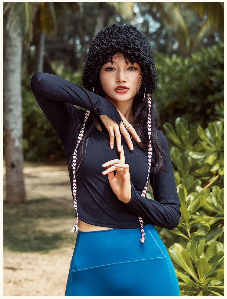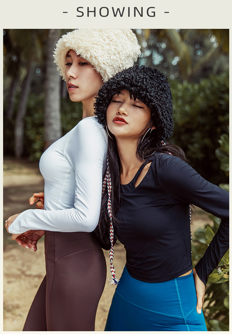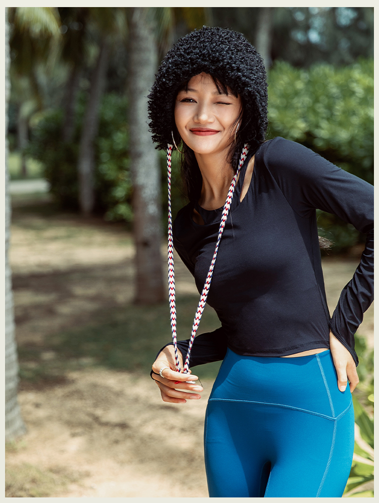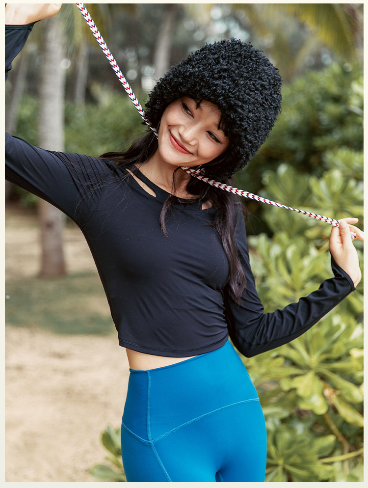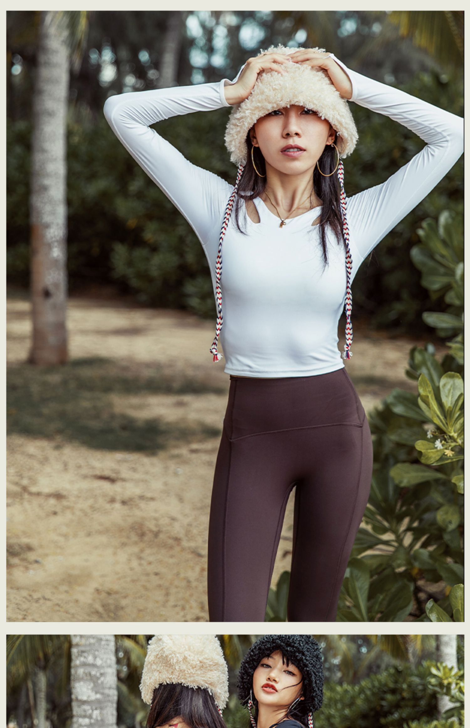 【裸感】法式红挂脖带胸垫长袖弹力紧身健身服女瑜伽服