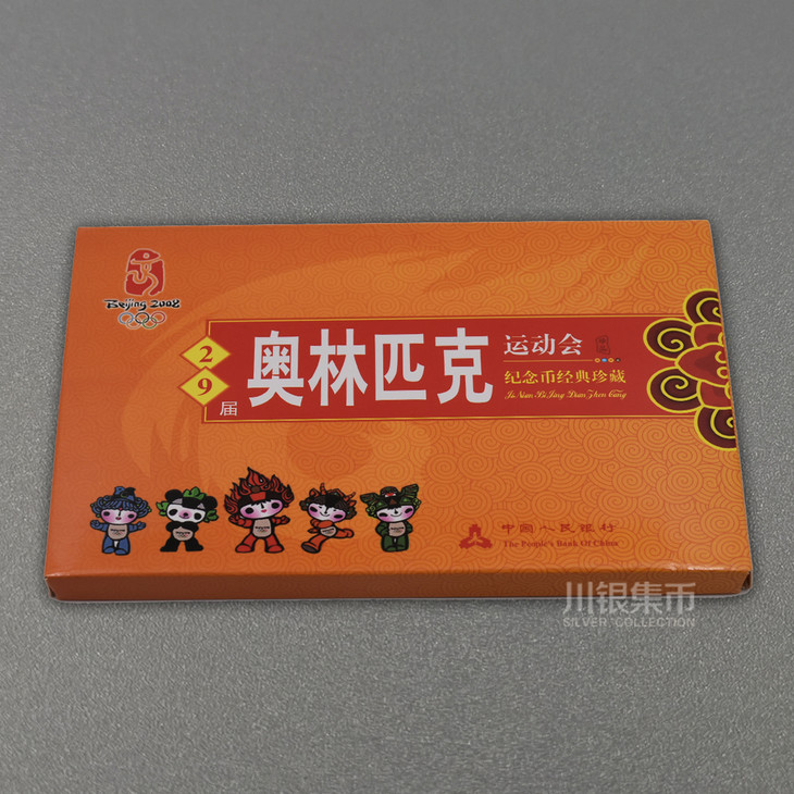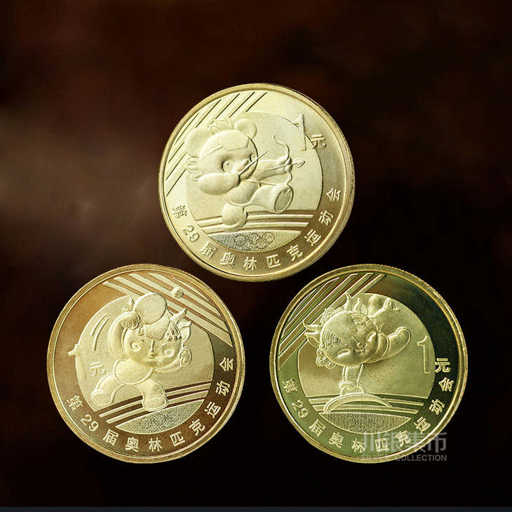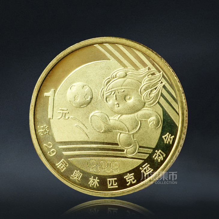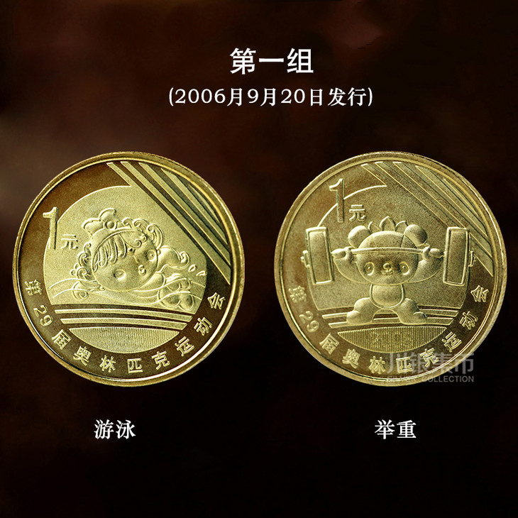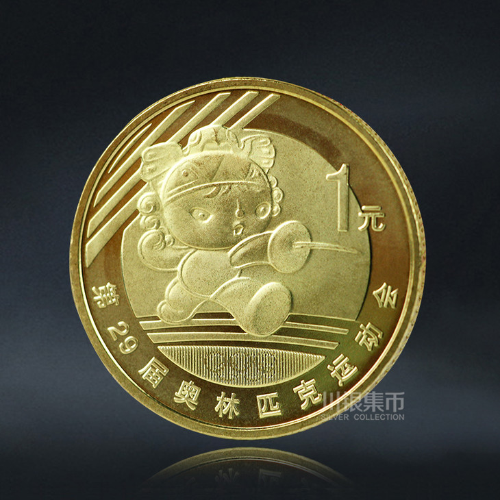 背面图案:为北京2008年奥林匹克运动会吉祥物福娃,举重、游泳、体操、射箭、乒乓球、足球、击剑、现代五项运动造型,左侧刊面值“1元”字样,下方刊“第29届奥林匹克奥运会”字样。