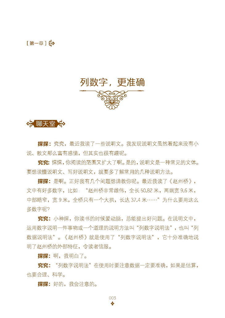 它是一位小老师,教你们掌握基本的说明方法,能够写出一些简明实用的说明文。全书共九章,前七章介绍常用说明方法,第八章拓展知识,第九章进行综合训练,每章都由“聊天室——说明会——探究坊”三部分组成。其中“说明会”中的文章分成两部分,一部分采用“批注”得方法,进行讲解。另一部则让同学们用来练习。