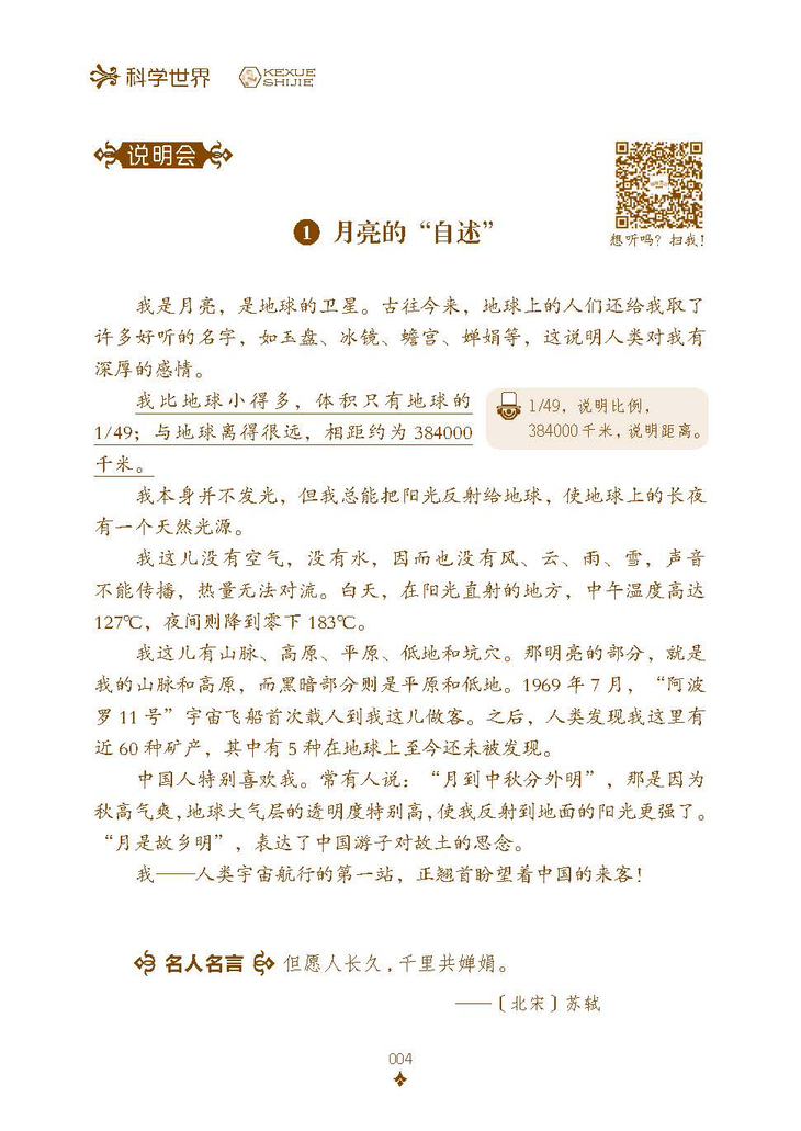 它是一名小向导,带你们走进深藏书中的大千世界。走近它,会叫疼的植物、能变色的动物、会登月的“玉兔”、能上天的导弹、显微镜下的微观世界、戈壁荒漠的奇珍宝藏,尽在其中,引人入胜。