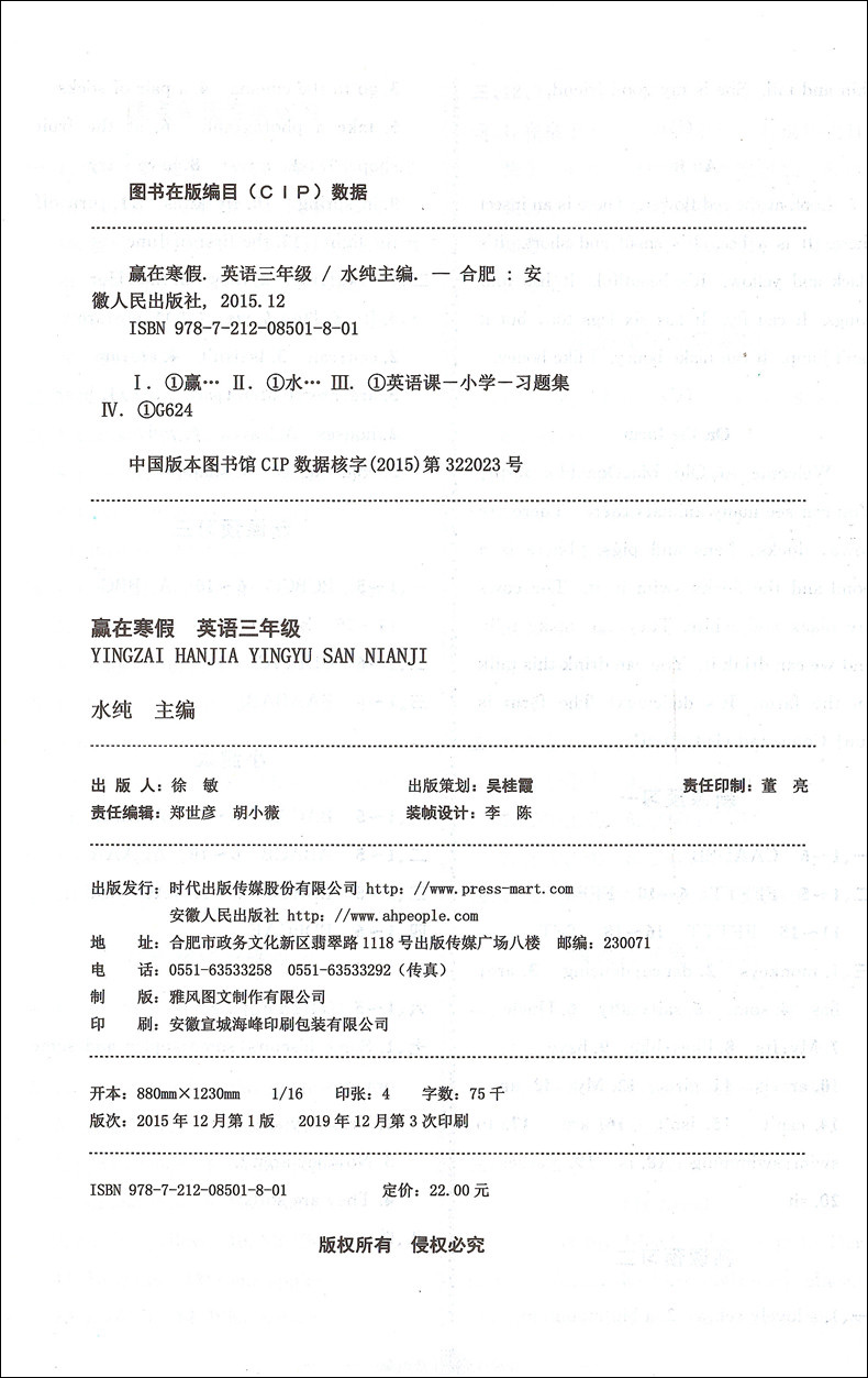 2020新版上海小学寒假作业 英语 3年级/三年级 赢在寒假 小学生寒假作业本练习册 基础巩固拓展提升新课预习 安徽人民出版社