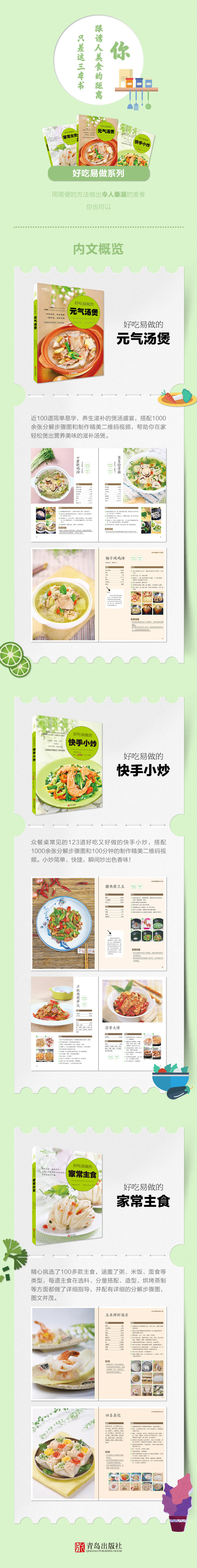 一方面,“爱心家肴”系列保持着一如既往的高品质;另一方面,在内容、版式上也越来越“接地气”。在内容上,更加注重健康实用;在版式上,努力做到时尚大方;在图片上,要求精益求精;在表述上,更倾向于分步详解、化繁为简,让读者快速上手、步步进阶,缩短您与幸福的距离。