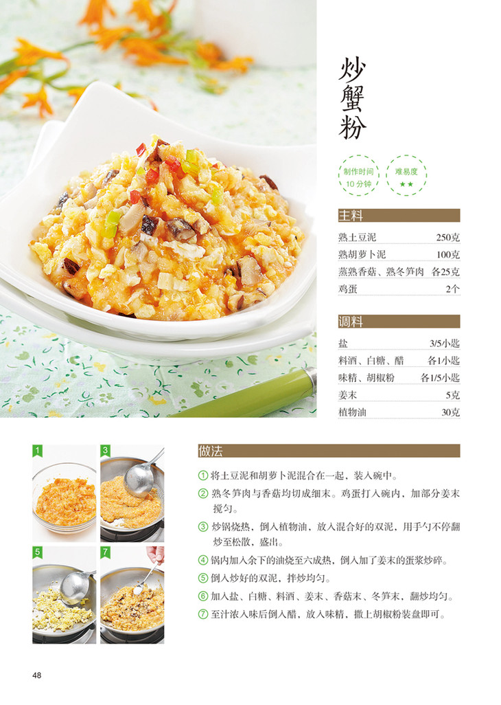 | 《好吃易做的新手家常菜》 本书是为厨房“菜鸟”准备的一本菜谱。收录124道适合新手制作的家常菜,搭配1000余张分解步骤图和100分钟的制作精美二维码视频。从食材处理,到火候、调料的掌握,帮助做菜零基础的你快速上手,并按难度等级进行划分,每道菜均配有详细完整的分步详解图,教您一步步完成菜肴的制作。 |