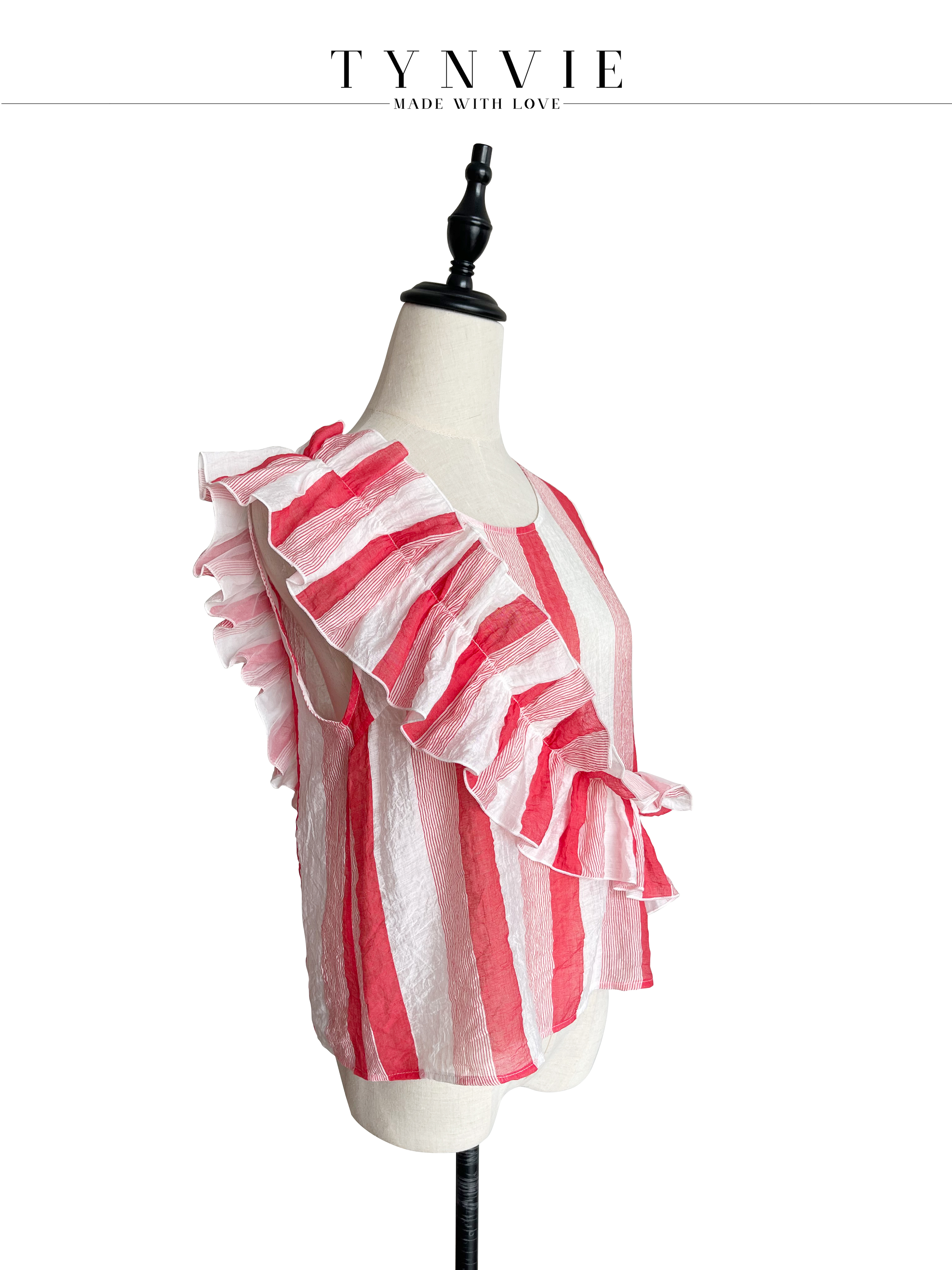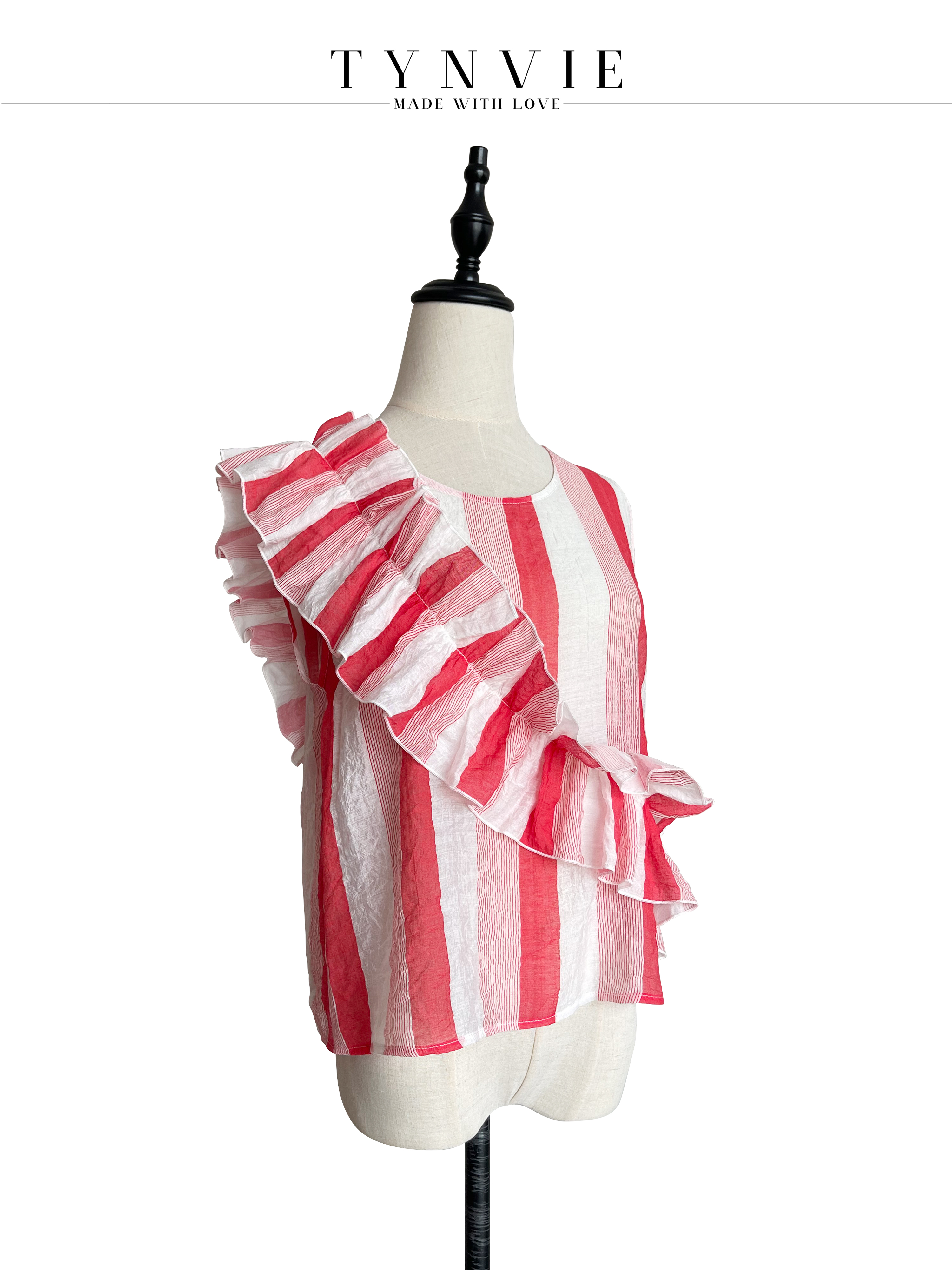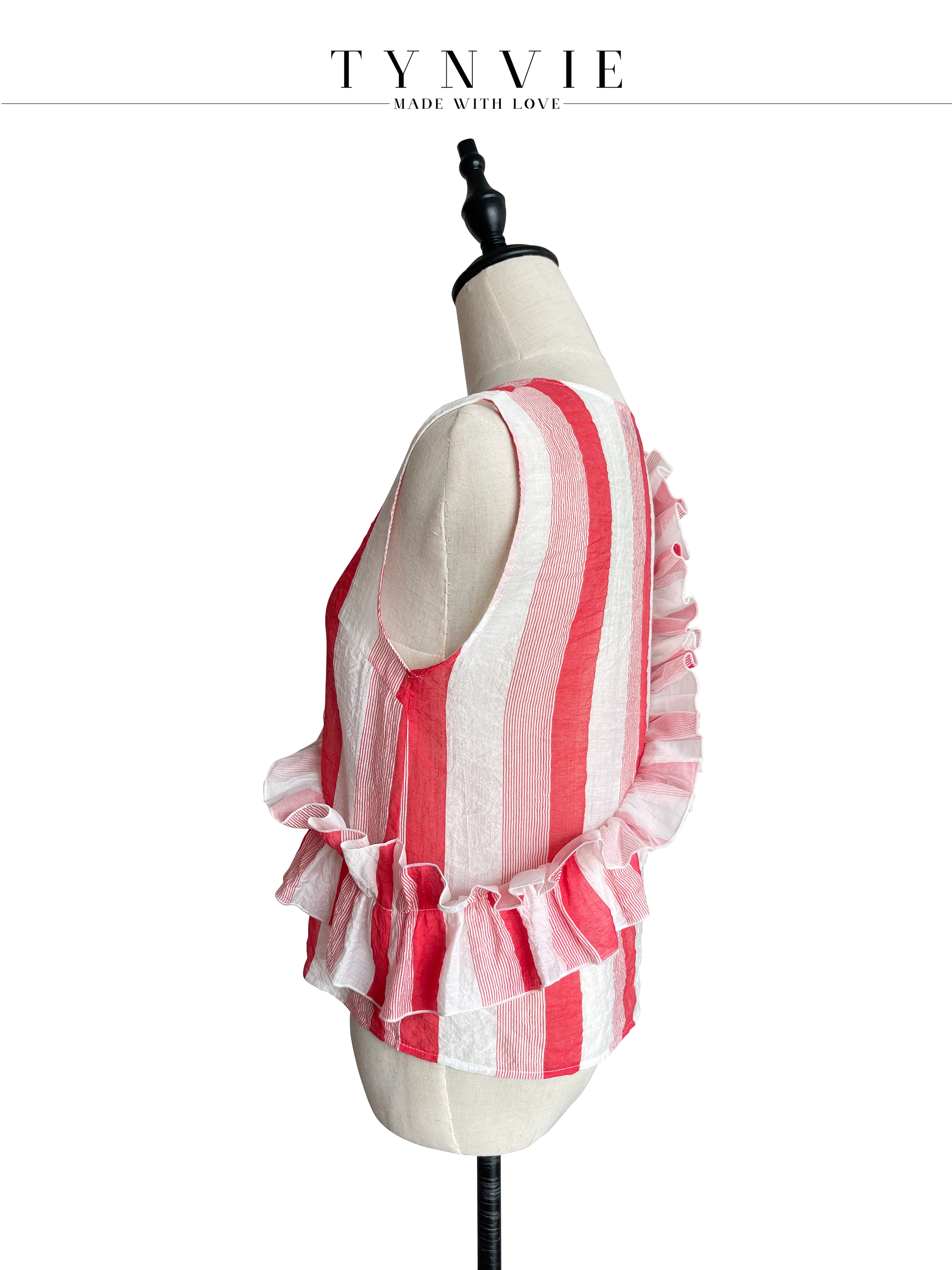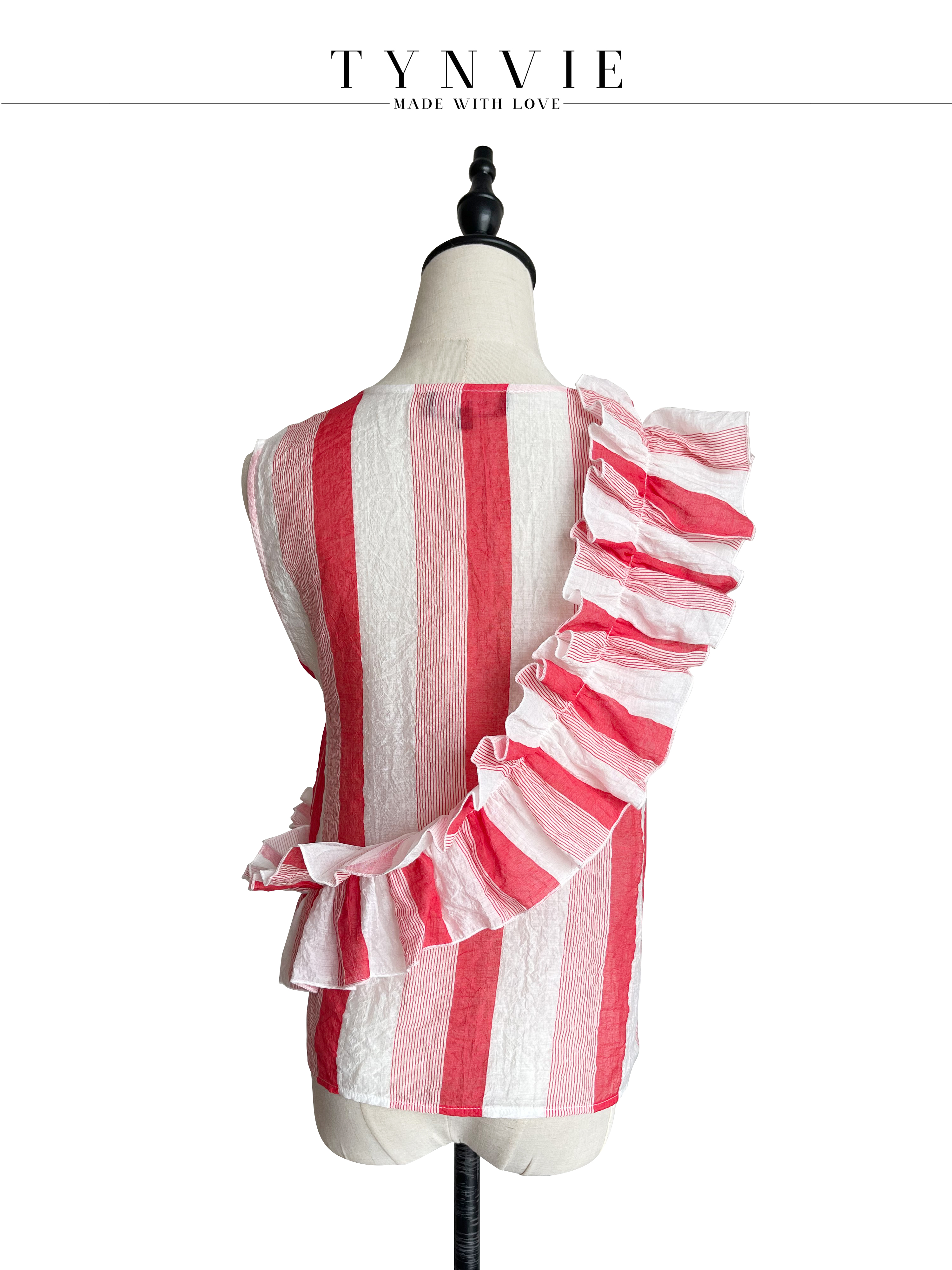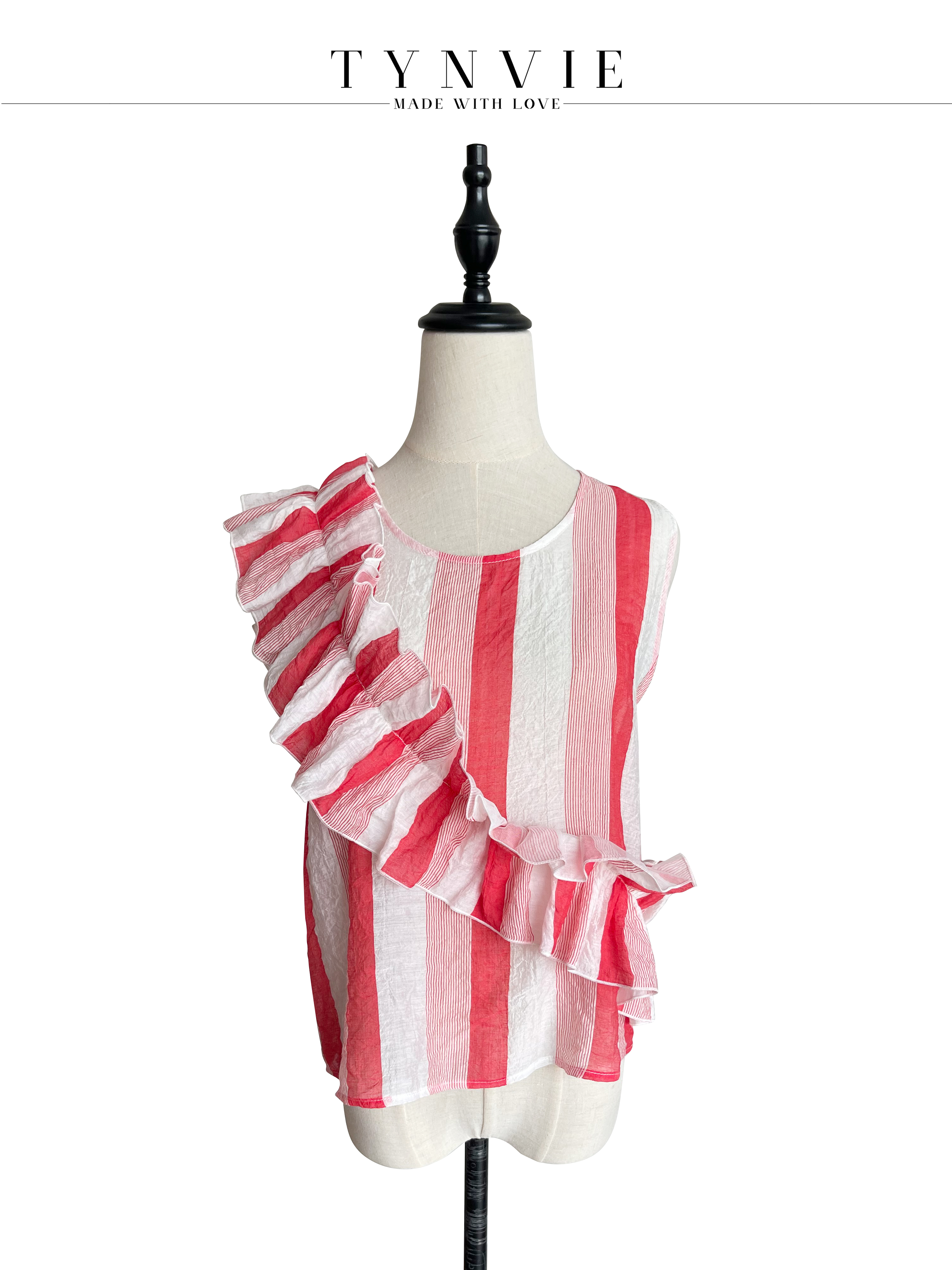 TYNVIE 大木耳边装饰无袖上衣-红白条纹
