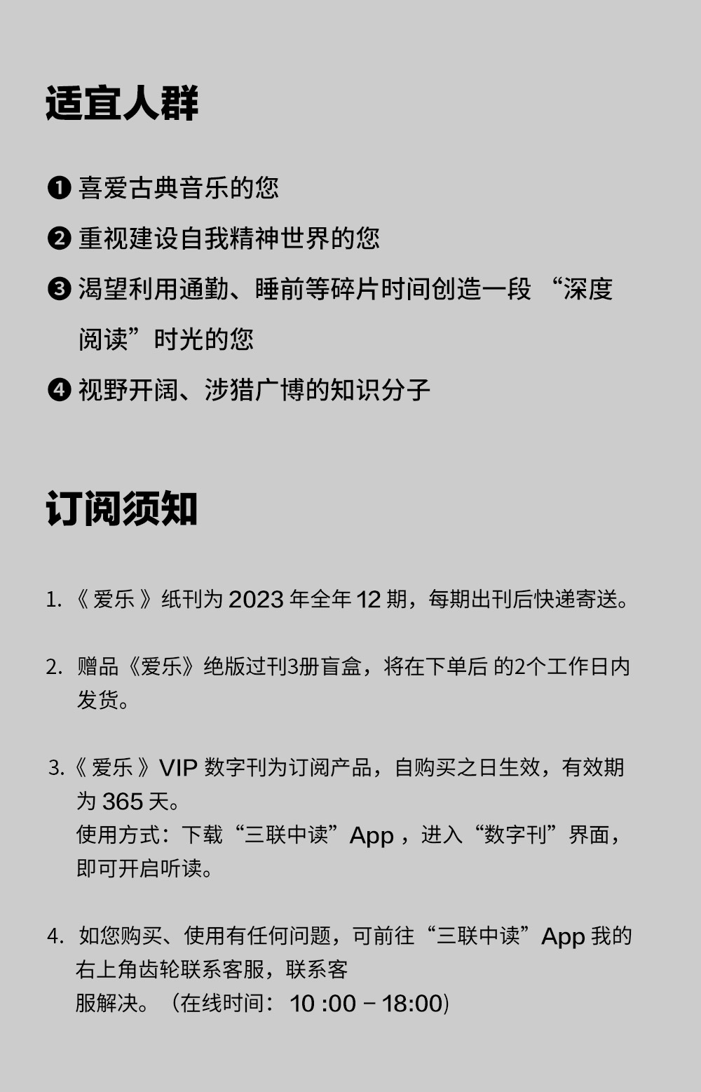 1.本订阅礼包为《爱乐》2023年1期至2023年12期共12期杂志订阅。不可自由选择起订日期。