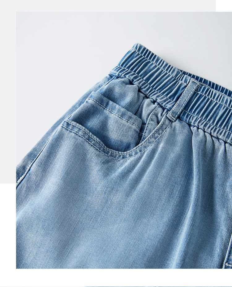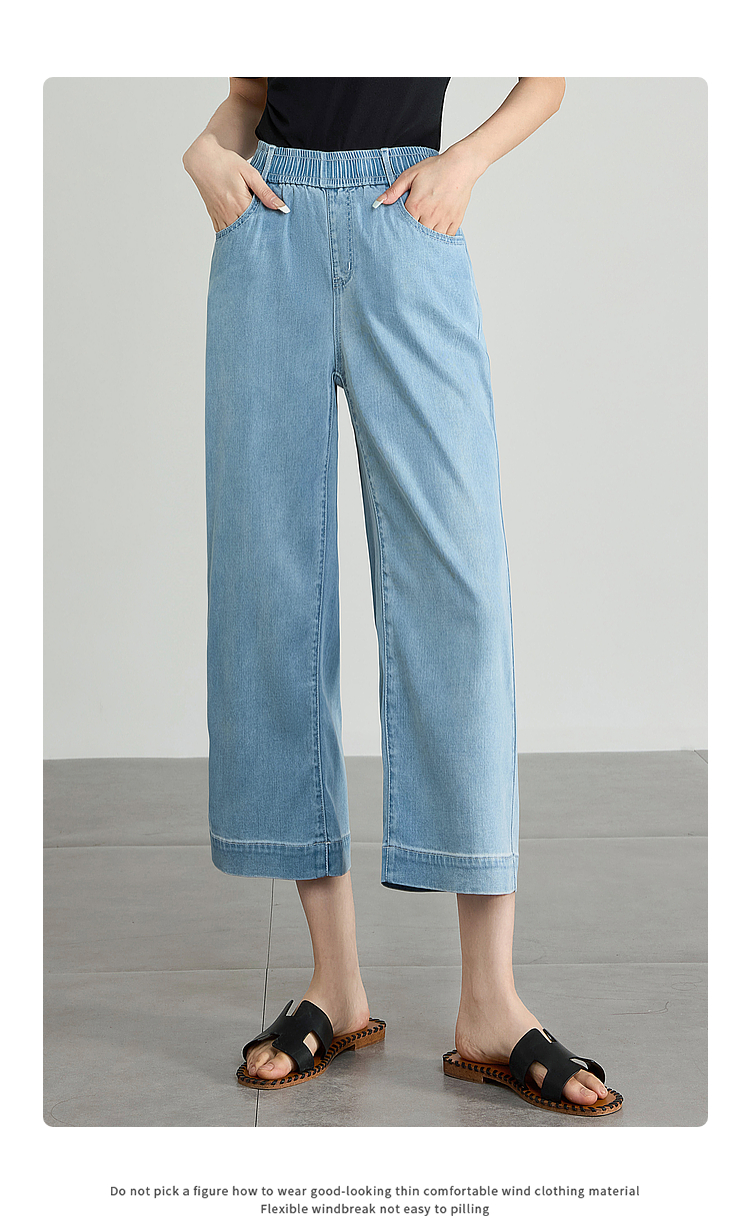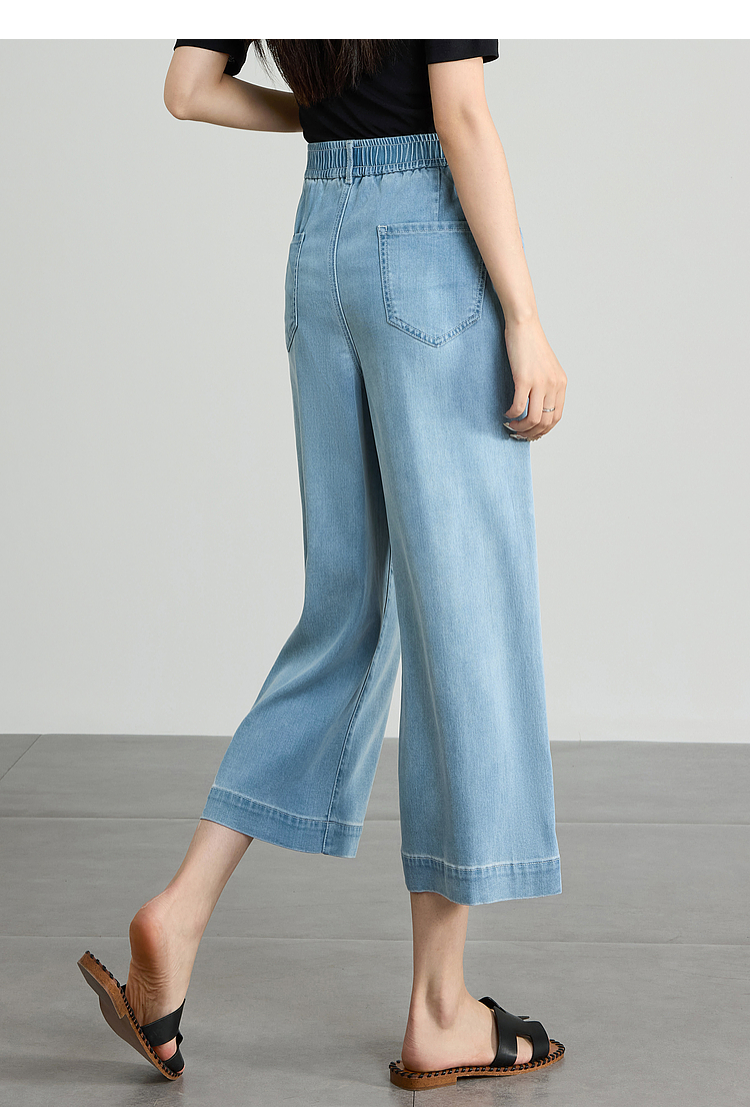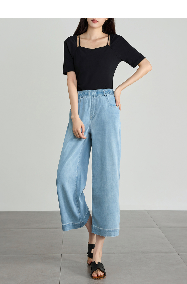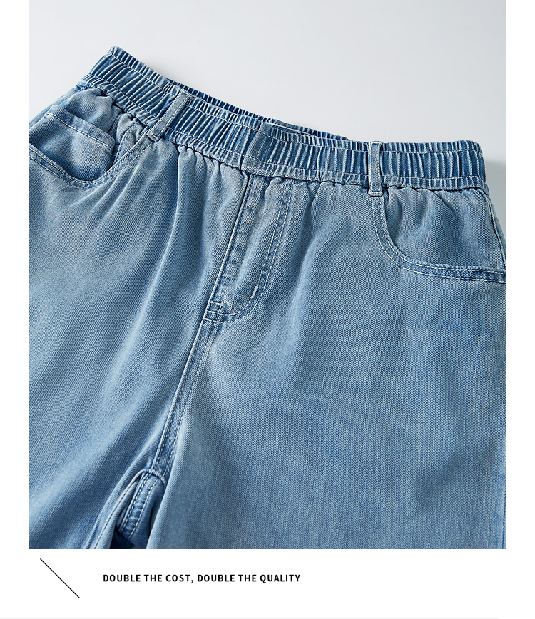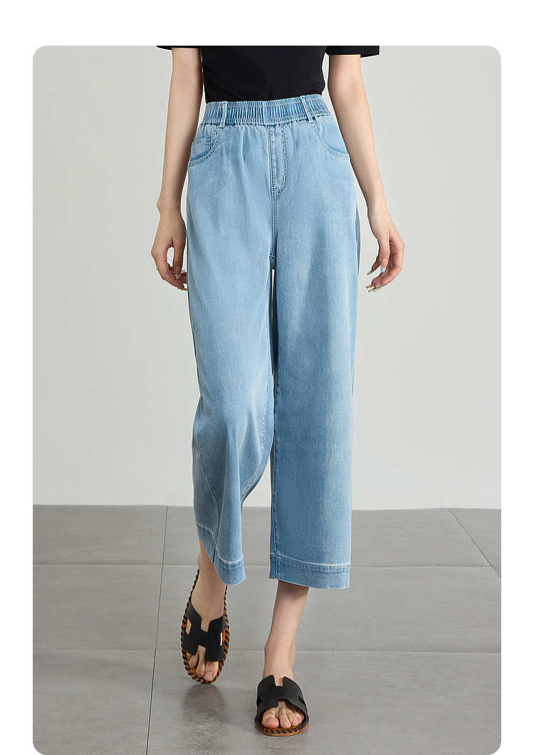 【专属特价】熙世界莱赛尔天丝八分牛仔裤宽松直筒裤夏季薄款垂感松紧腰裤子