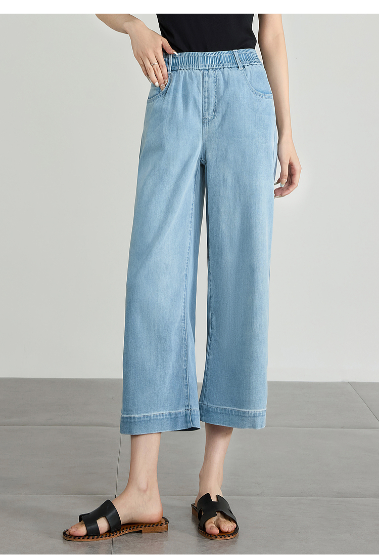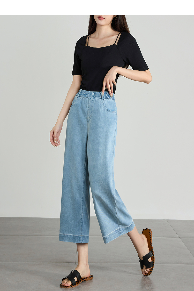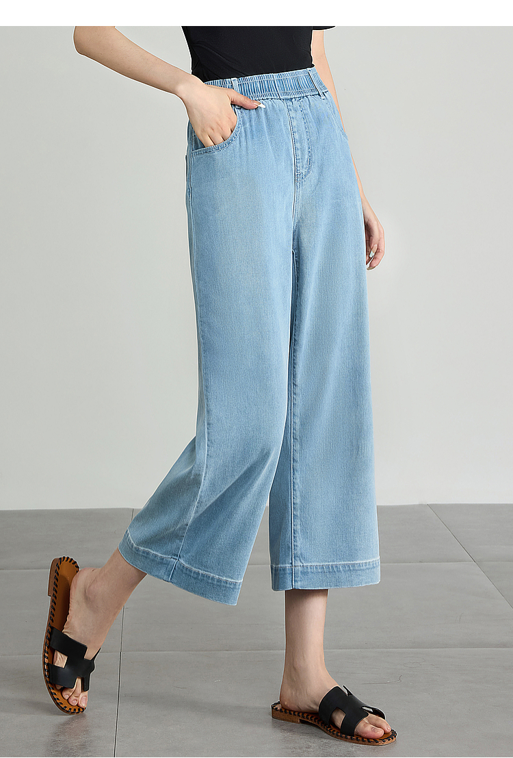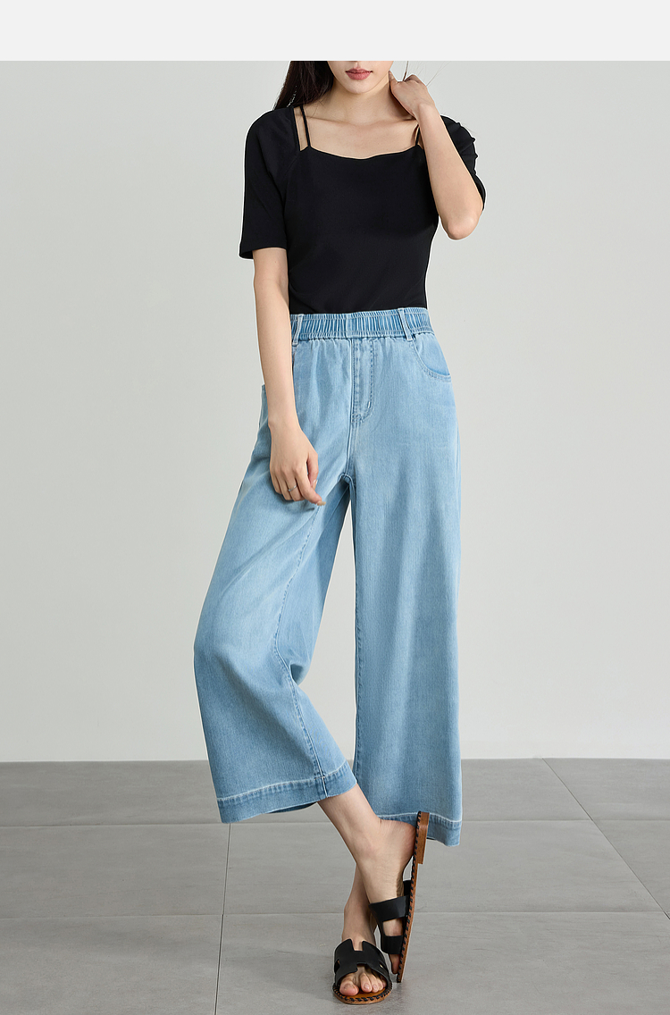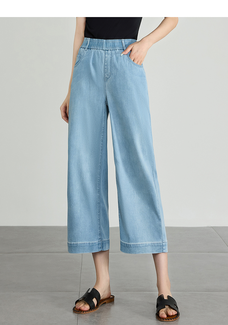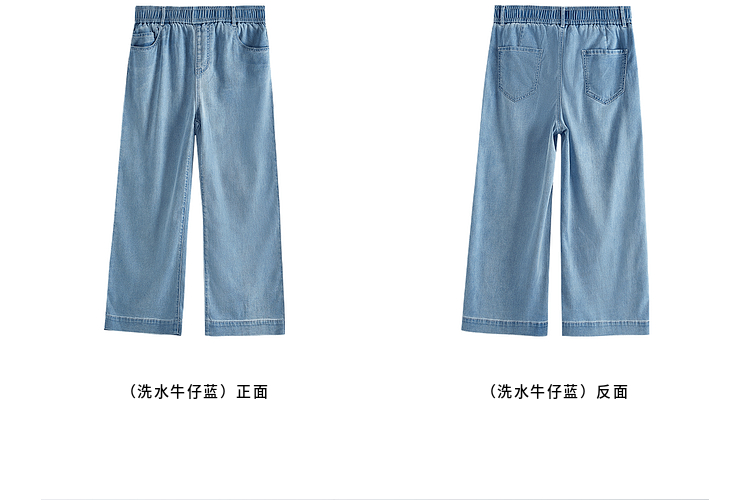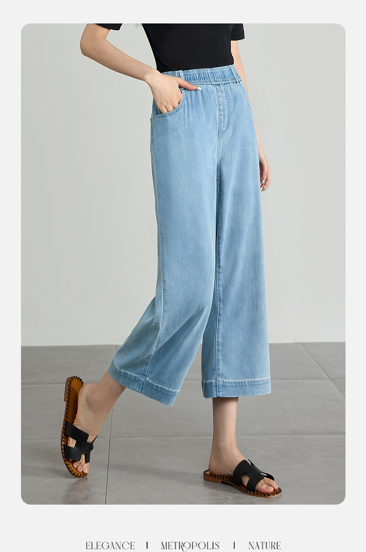 【专属特价】熙世界莱赛尔天丝八分牛仔裤宽松直筒裤夏季薄款垂感松紧腰裤子