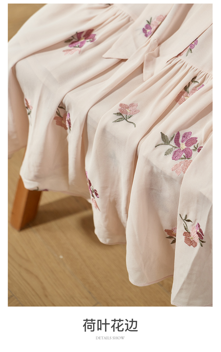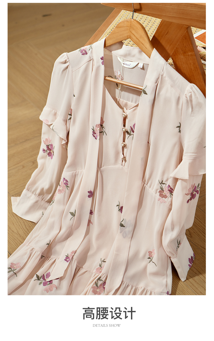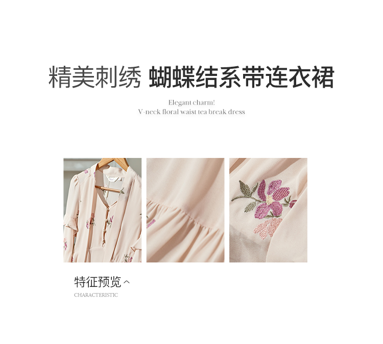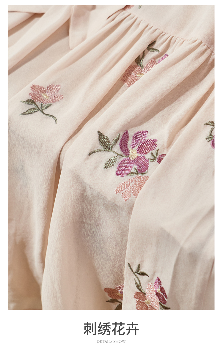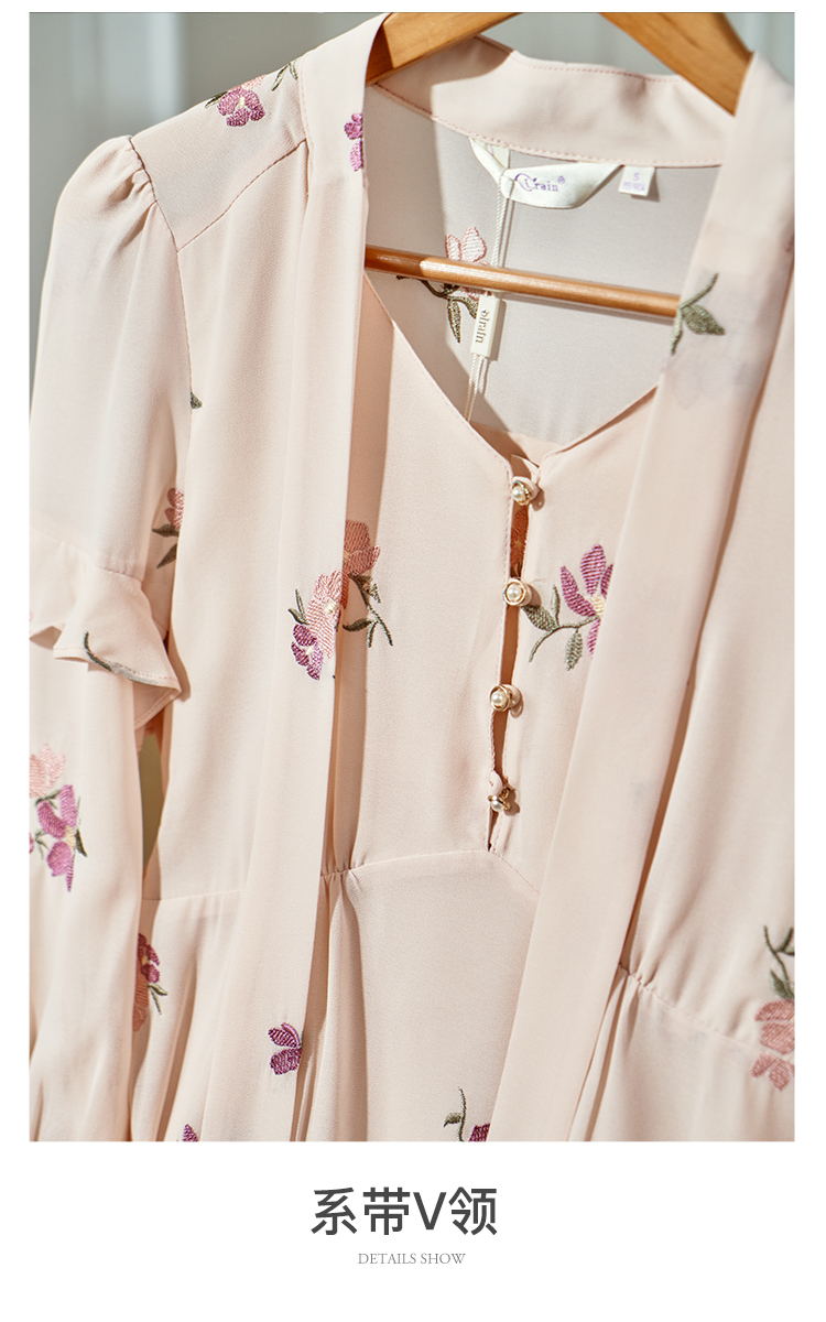 欧芮儿新款刺绣雪纺连衣裙女 修身长袖蝴蝶结中长款A字裙
