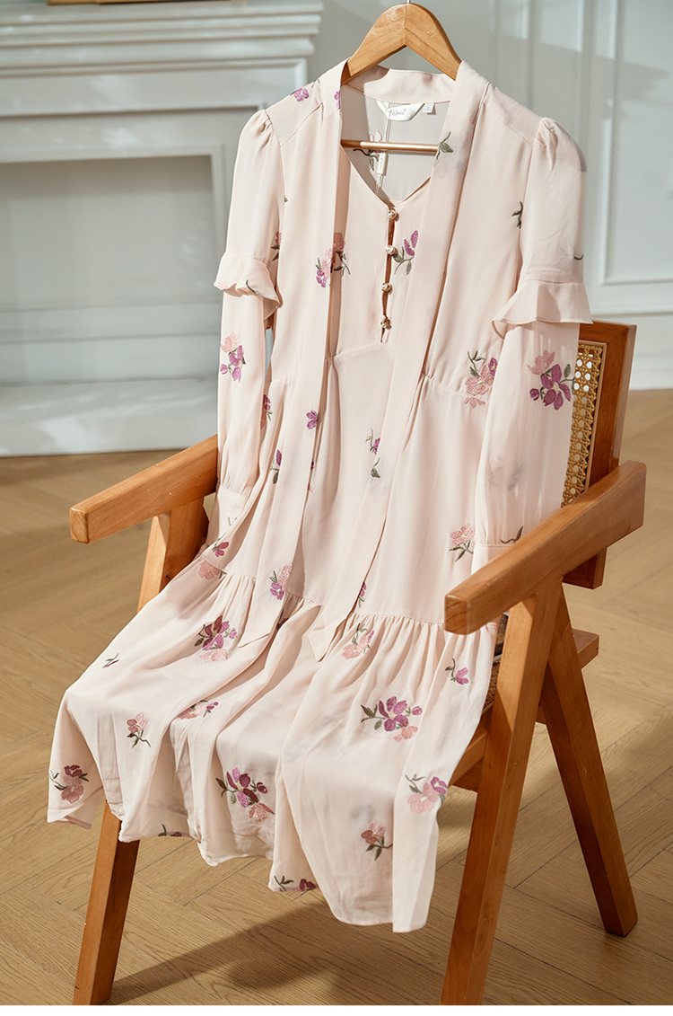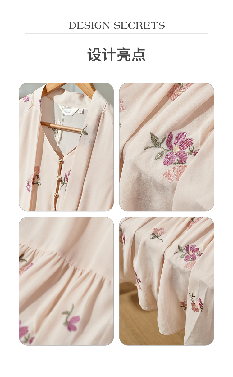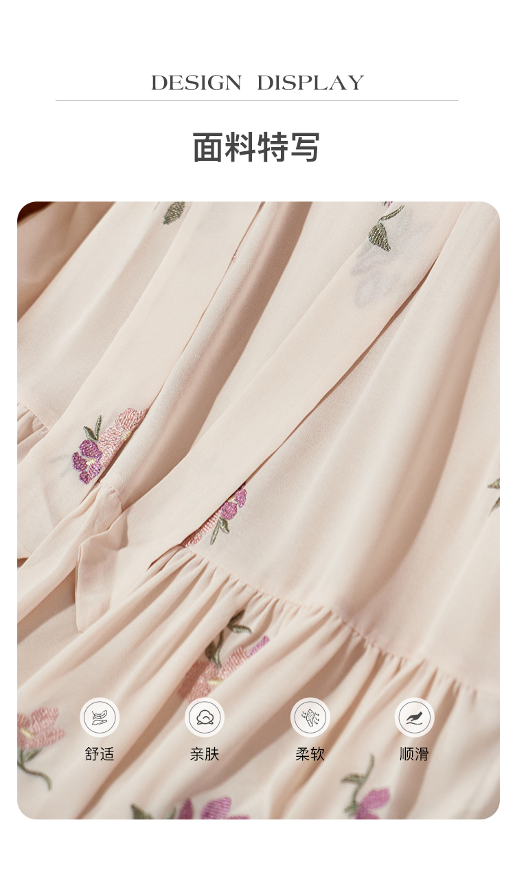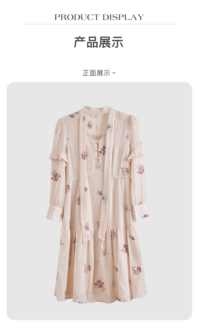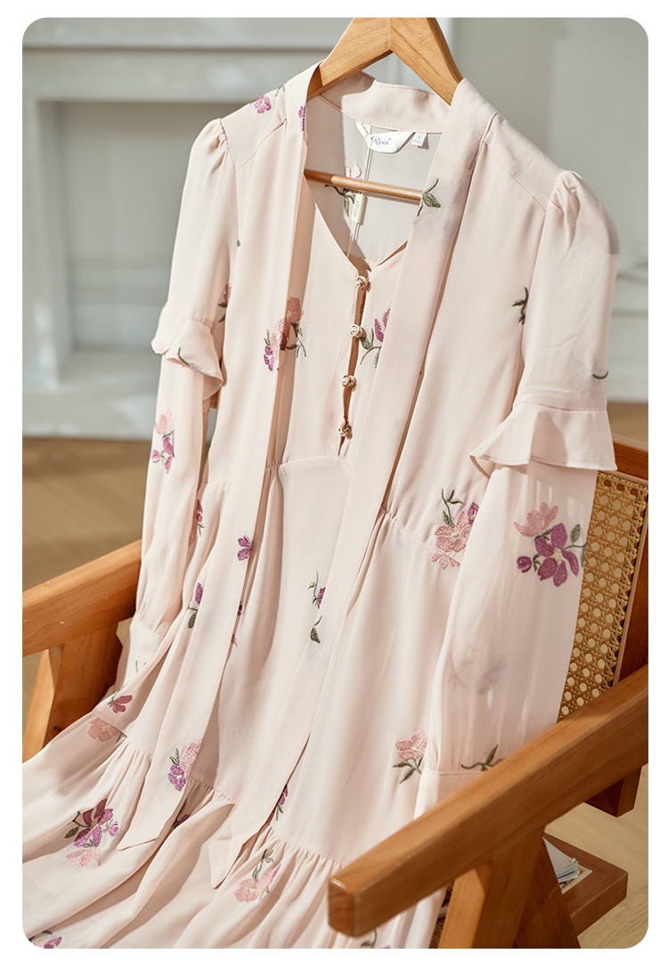 欧芮儿新款刺绣雪纺连衣裙女 修身长袖蝴蝶结中长款A字裙