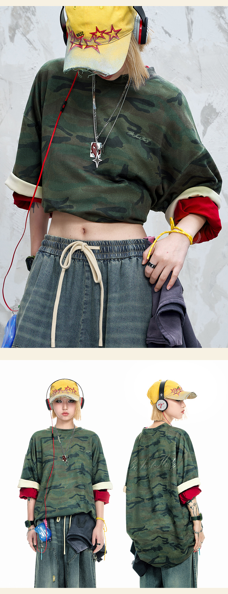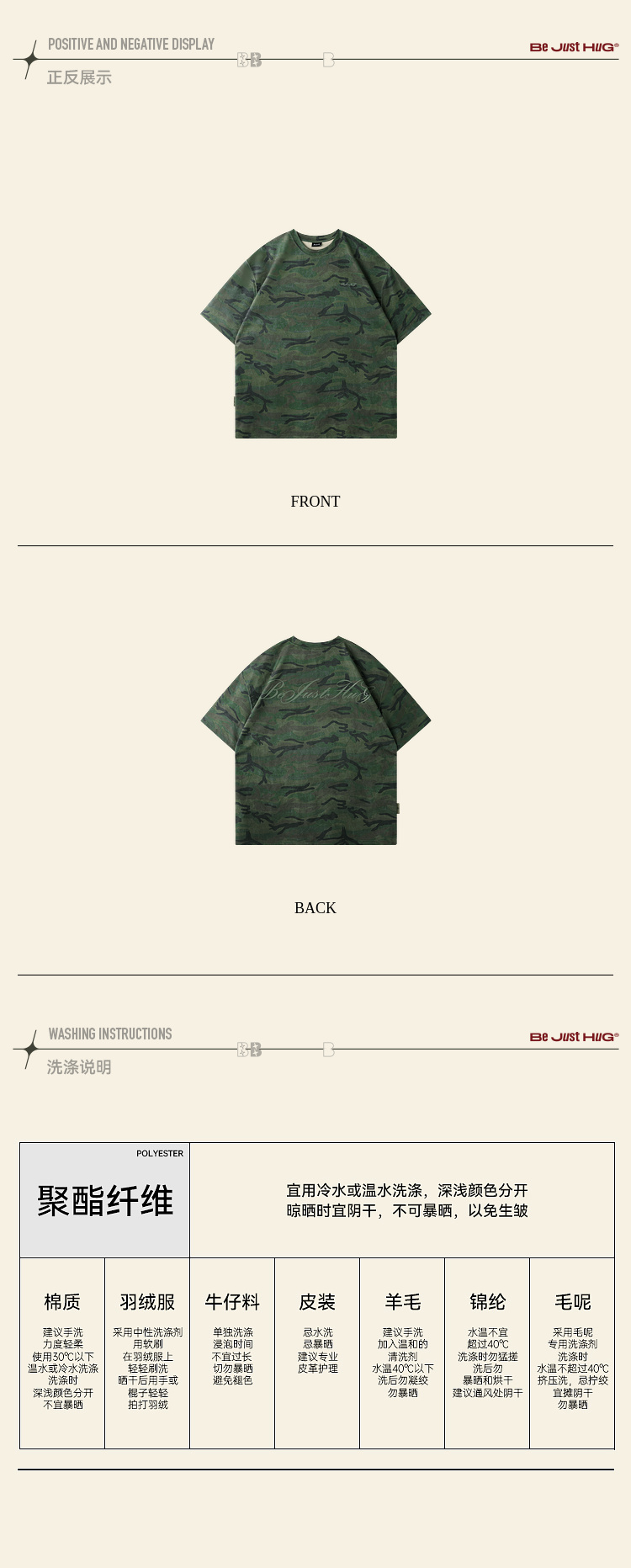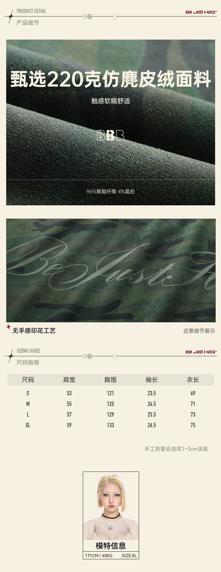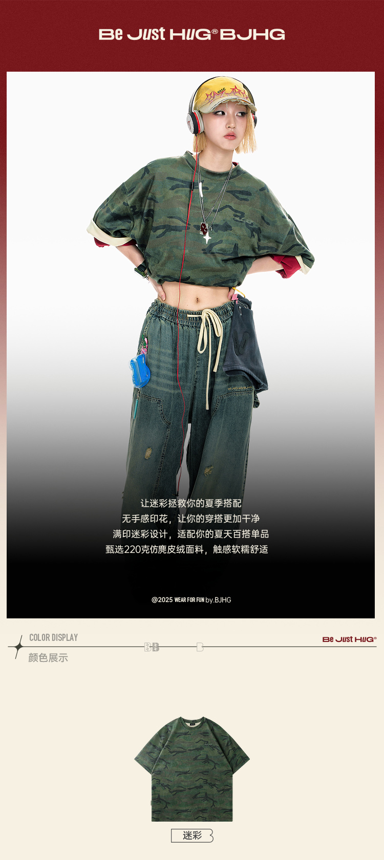 BJHG不计后果 迷彩短袖t恤女夏季潮仿麂皮绒美式高街宽松复古上衣