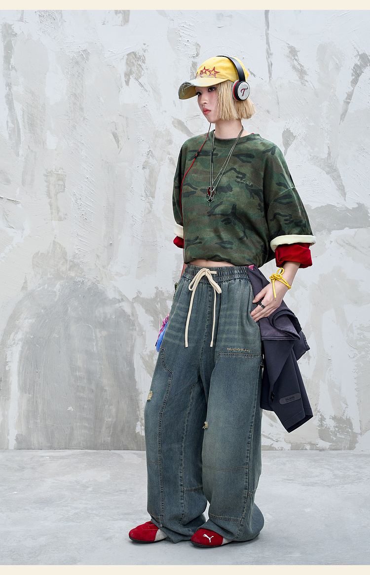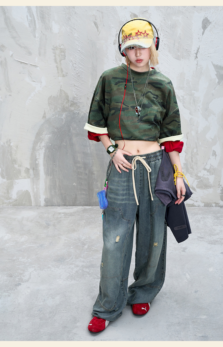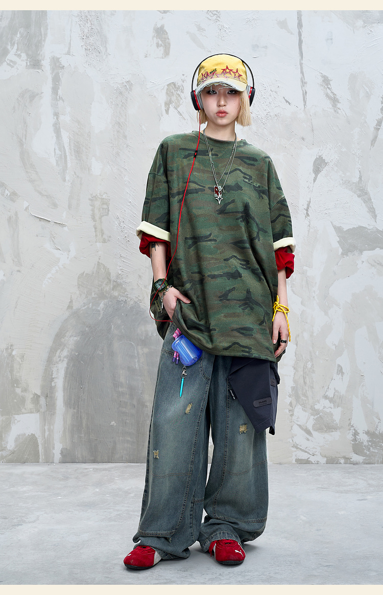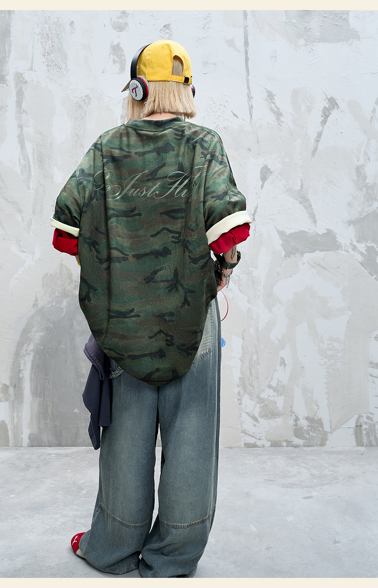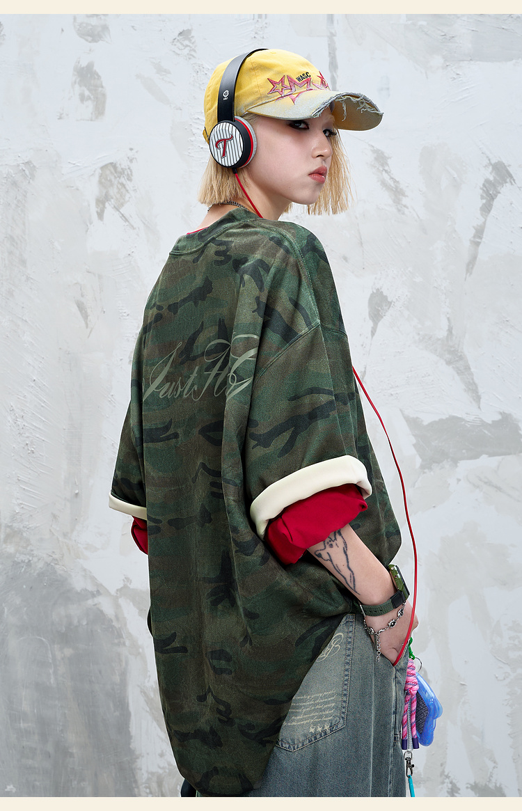BJHG不计后果 迷彩短袖t恤女夏季潮仿麂皮绒美式高街宽松复古上衣