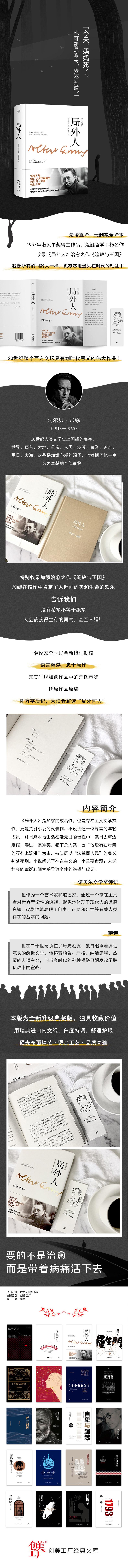 "1.“今天,妈妈死了。也可能是昨天,我不知道。”人类文学史惊艳开头之一,来自加缪的代表作《局外人》。 2.1957年诺贝尔奖得主作品,荒诞哲学不朽名作,20世纪整个西方文坛具有划时代意义的伟大作品! 3.加缪,20世纪人类文学史闪耀的名字。 世界、痛苦、大地、母亲、人类、沙漠、荣誉、苦难、夏日、大海。这些是加缪心爱的赐予,也概括了他一生为之奉献的全部事物。 4.翻译家李玉民全新修订勘校 语言精湛,忠于原作 完美呈现加缪作品中的荒谬意味 还原作品原貌 附万字后记,为读者解读“局外何人”。 5.法语直译,无删减全译本。 6.特别收录加缪治愈之作《流放与王国》,加缪在该作中肯定了人世间的美和生命的欢乐。告诉我们:没有希望不等于绝望,人应该获得生存的勇气,甚至幸福! 7.随书附赠精美书签:我像所有的同龄人一样,孤零零地迷失在时代的动乱中。 8.本版为全新升级典藏版,独具收藏价值 ·选用瑞典进口内文纸,白度特调,舒适护眼 ·硬壳精装,烫金工艺,品质高雅 ·环保生态标签认证 读经典,就选创美工厂版本 9.重要的不是治愈,而是带着病痛活下去。——加缪"