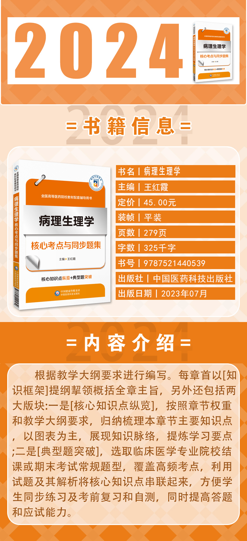 根据教学大纲要求进行编写。每章首以[知识框架]提纲挈领概括全章主旨,另外还包括两大版块:一是[核心知识点纵览],按照章节权重和教学大纲要求,归纳梳理本章节主要知识点,以图表为主,展现知识脉络,提炼学习要点;二是[典型题突破],选取临床医学专业院校结课或期末考试常规题型,覆盖高频考点,利用试题及其解析将核心知识点串联起来,方便学生同步练习及考前复习和自测,同时提高答题和应试能力。
