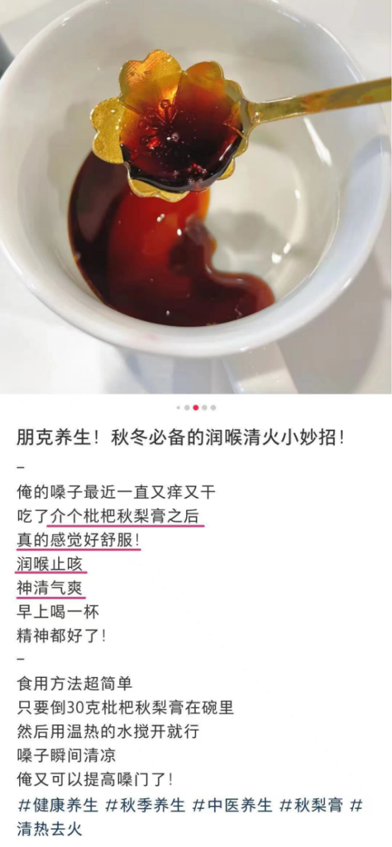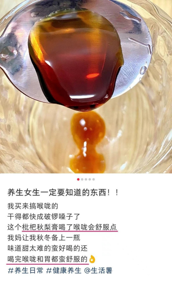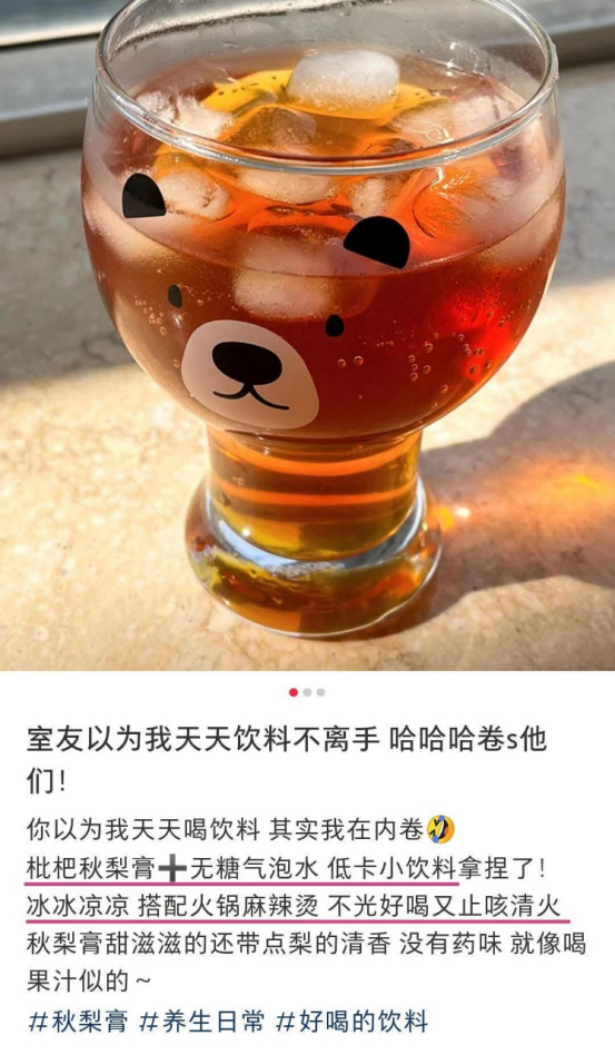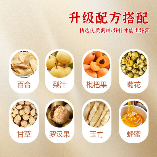 【配料表】梨汁、枇杷果、百合、菊花、甘草、罗汉果、玉竹、蜂蜜
