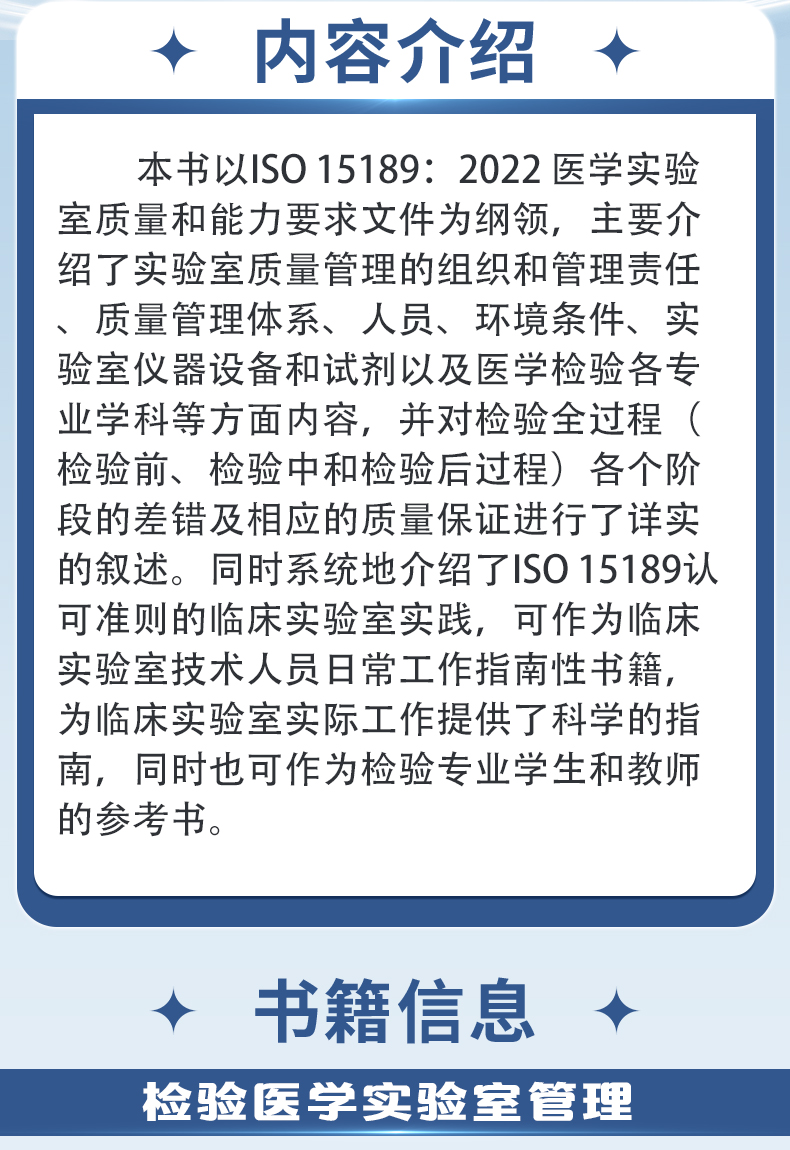 本书以ISO 15189:2022 医学实验室质量和能力要求文件为纲领,主要介绍了实验室质量管理的组织和管理责任、质量管理体系、人员、环境条件、实验室仪器设备和试剂以及医学检验各专业学科等方面内容,并对检验全过程(检验前、检验中和检验后过程)各个阶段的差错及相应的质量保证进行了详实的叙述。同时系统地介绍了ISO 15189认可准则的临床实验室实践,可作为临床实验室技术人员日常工作指南性书籍,为临床实验室实际工作提供了科学的指南,同时也可作为检验专业学生和教师的参考书。