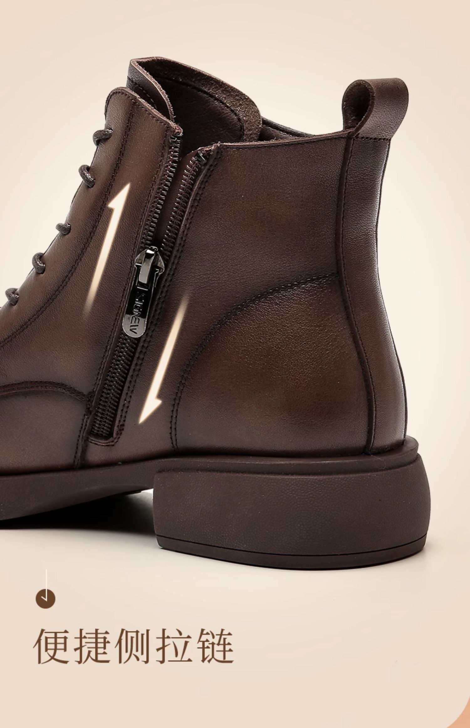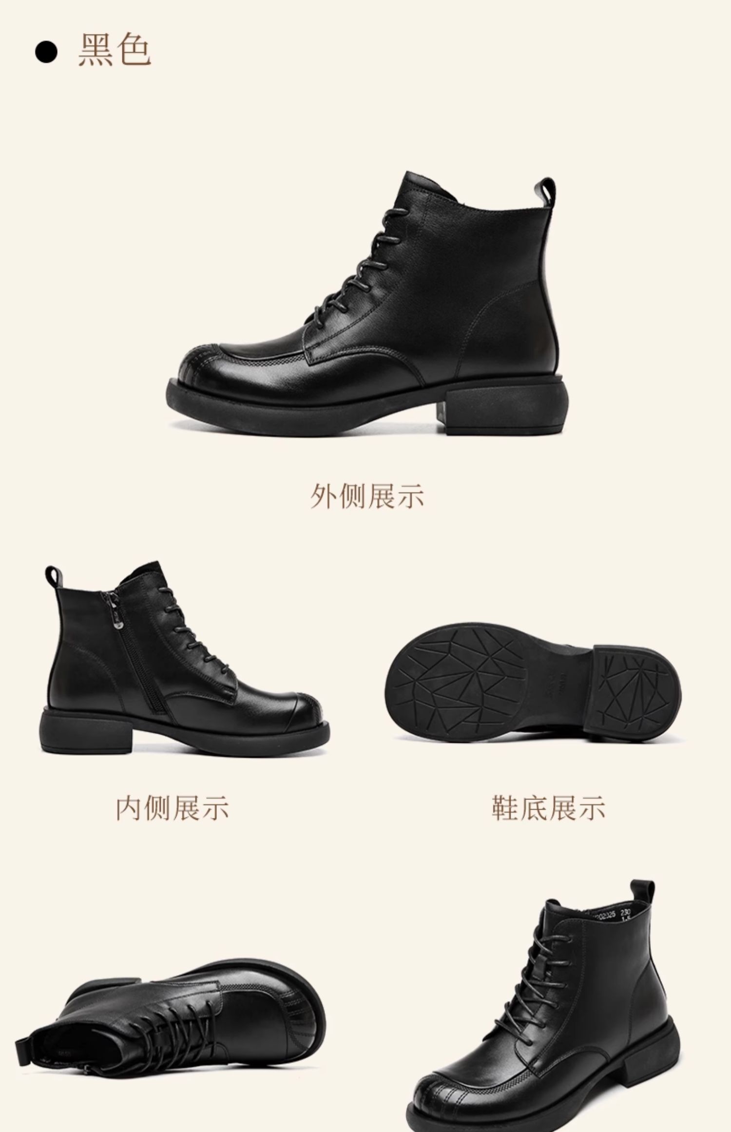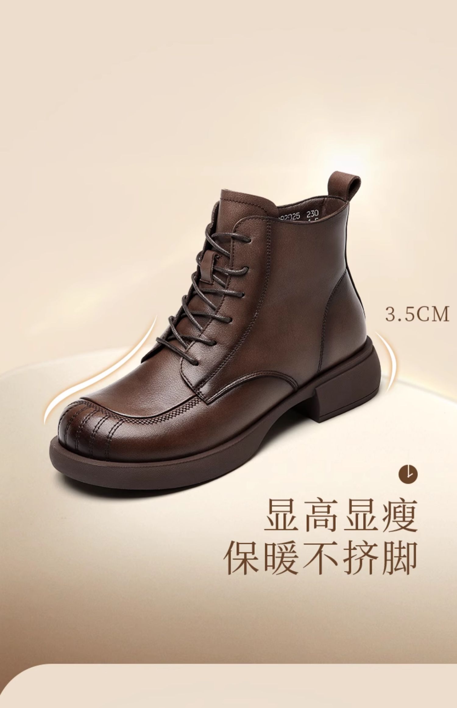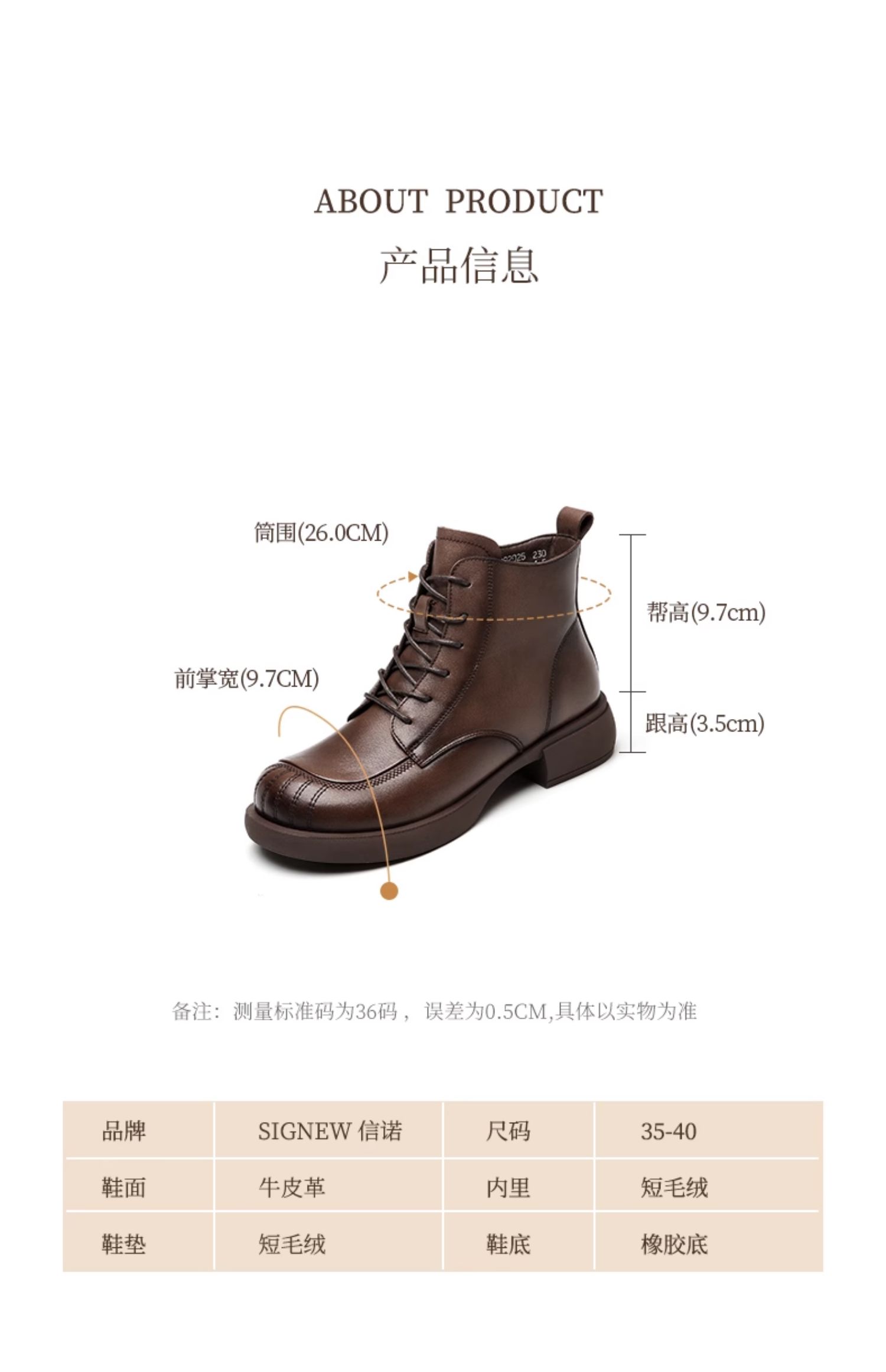 信诺真皮厚底短靴女2023秋冬新款女士加绒保暖皮鞋大头马丁靴棉鞋23M178-6H