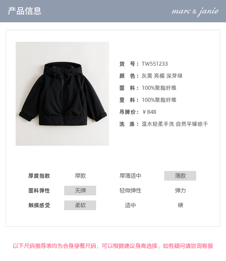 【无氟防泼水】马克珍妮男女童轻户外夹克外套2025秋装新品551233