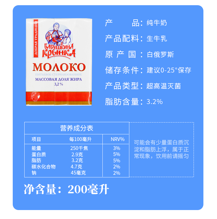 白俄罗斯祖母奶罐纯牛奶 脂肪含量 3.2%