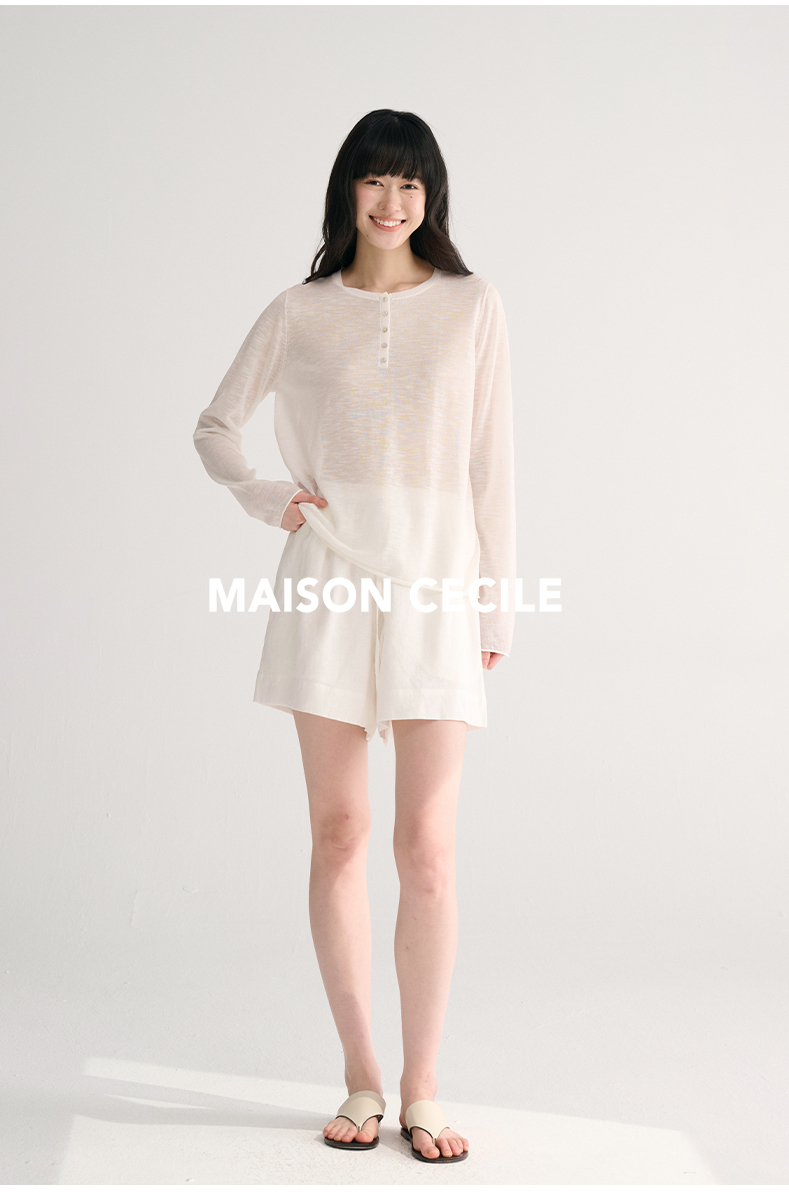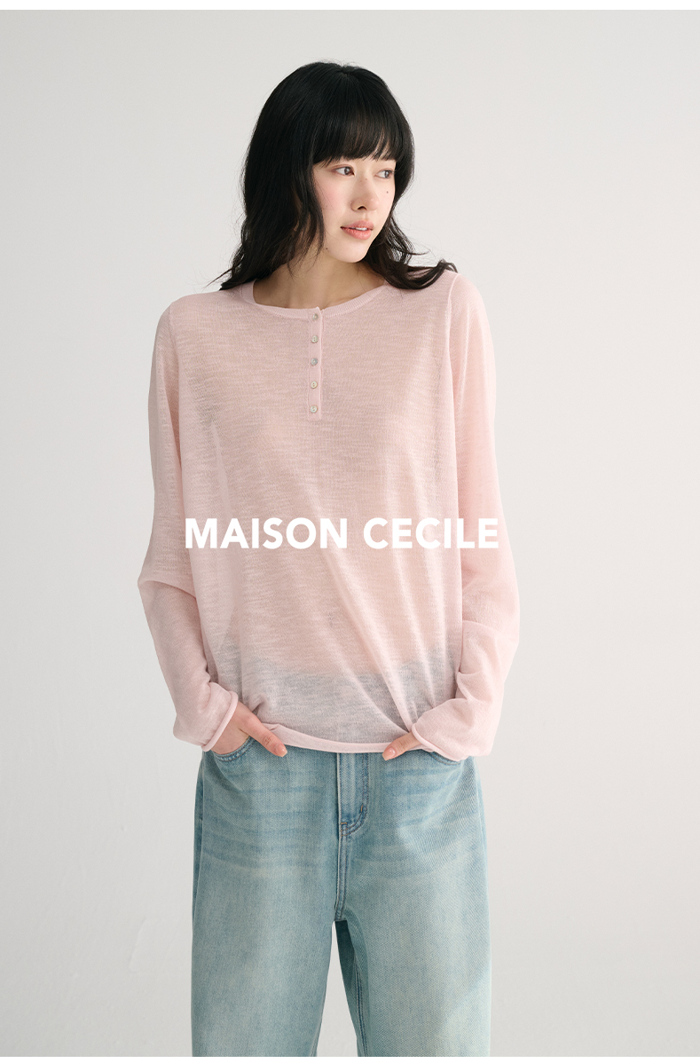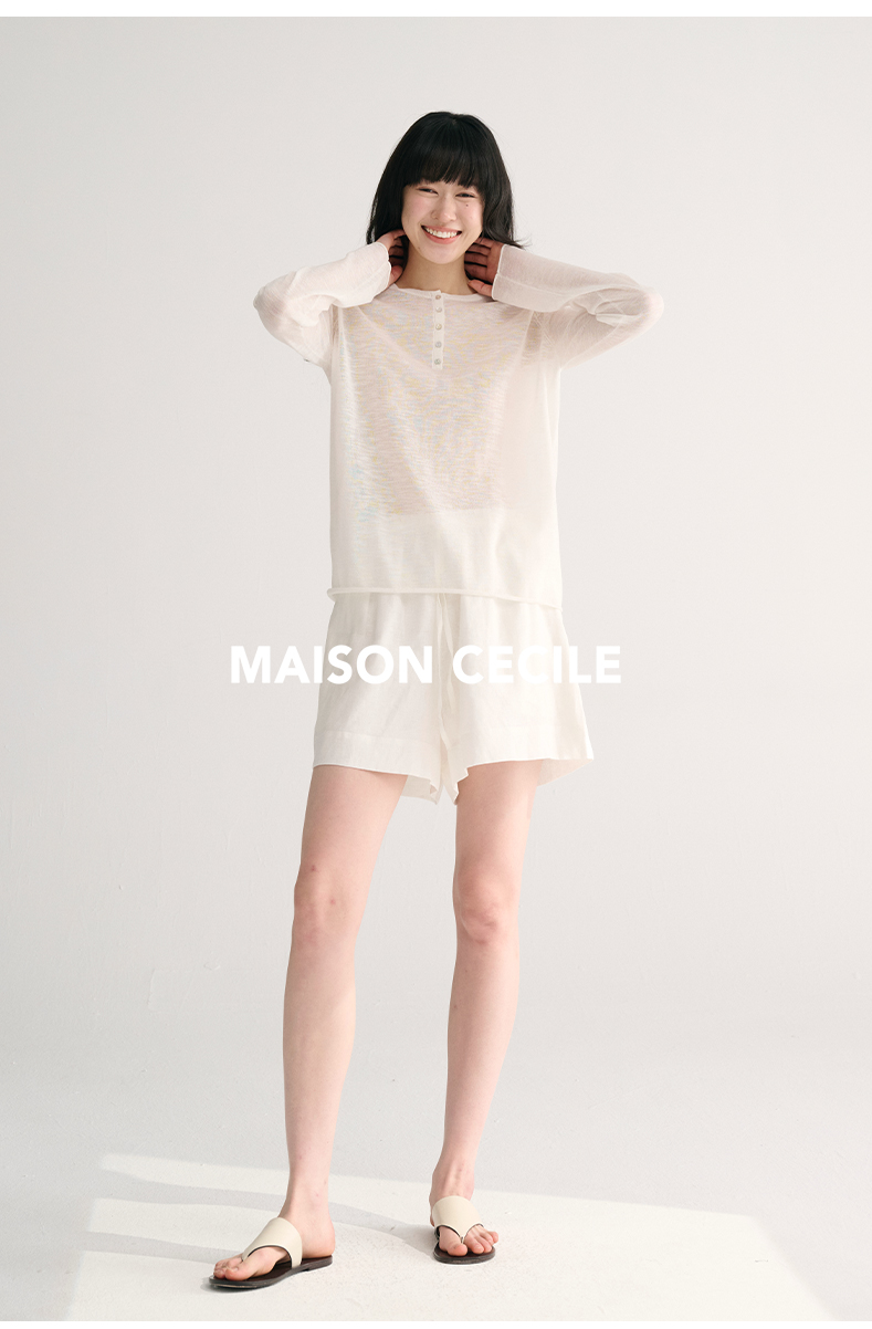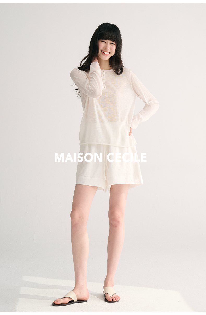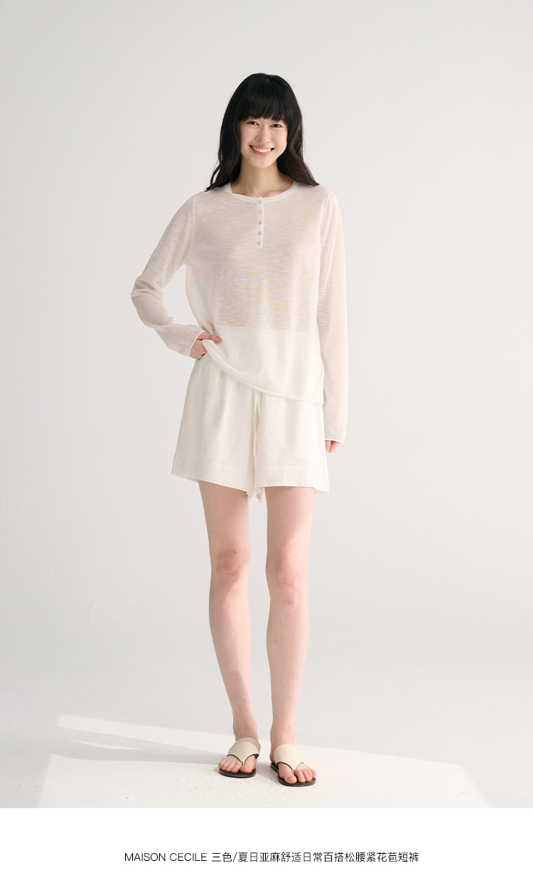 MAISON CECILE 三色/夏日亚麻混纺竹节纹肌理凉感亨利领针织上衣