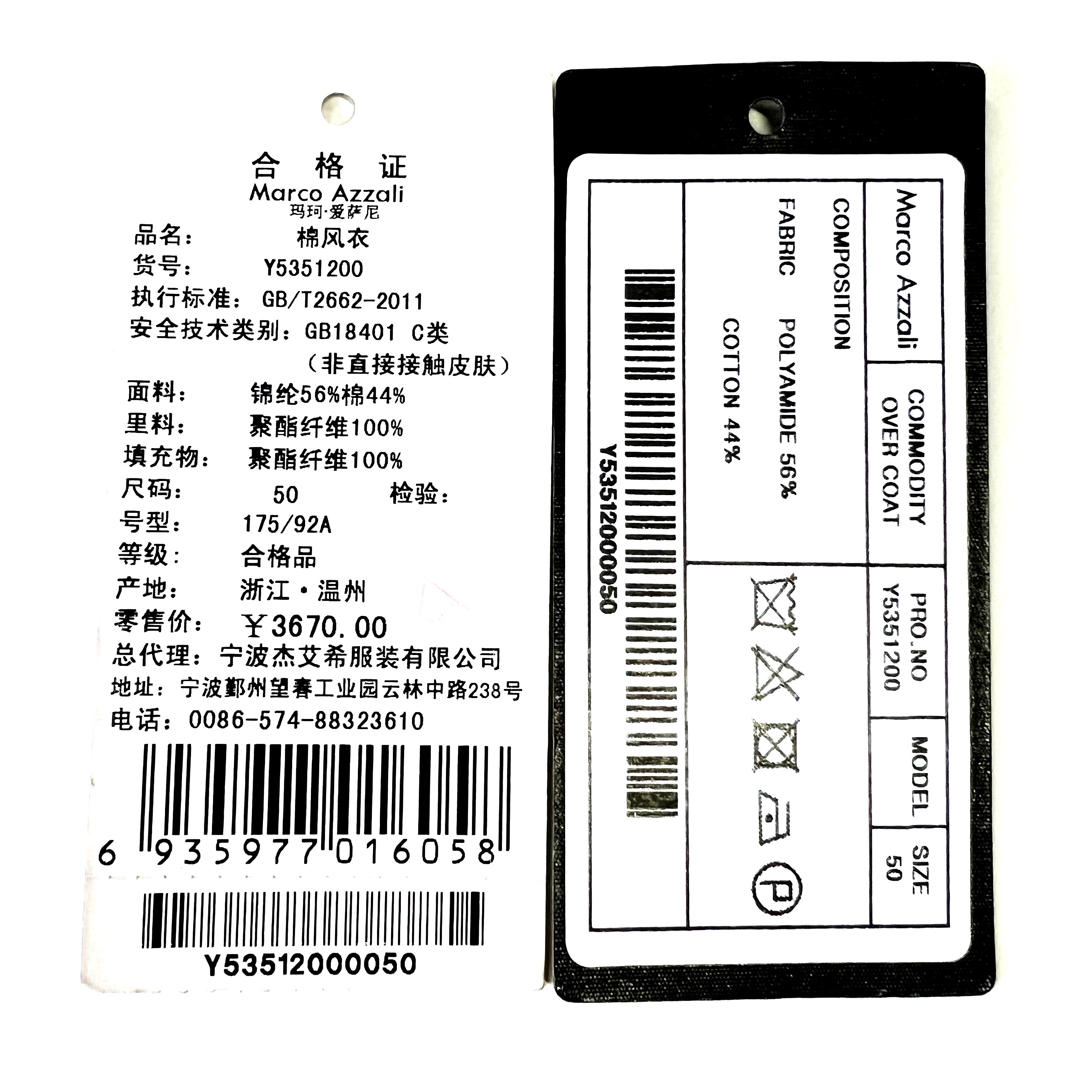 Marco Azzali 黑色运动款连帽棉风衣 Y5351200