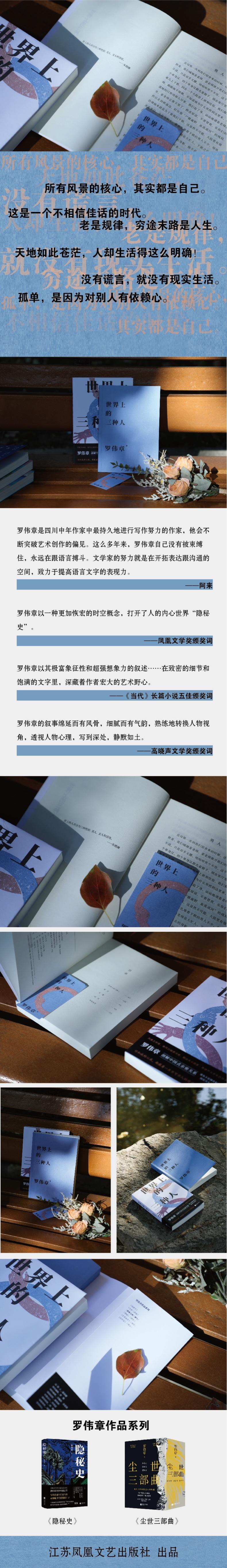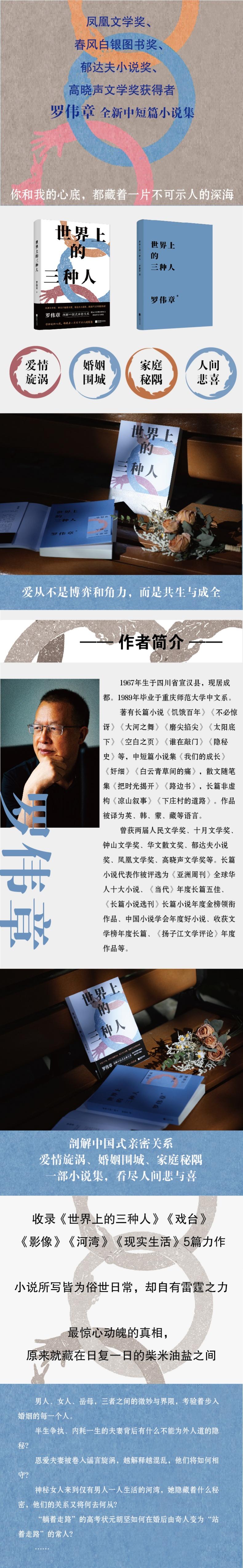本书拟收录罗伟章全新创作的中短篇小说《芦苇》《世界上的三种人》《戏台》《影像》《现实生活》等作品。这些故事虽然各自独立,却均涉及婚姻、家庭、爱情等主题, 共同构成了一幅幅丰富多彩的社会画卷。如《影像》中,马三和苏小姝是一对恩爱的夫妻, 但是身边的朋友却宁愿相信二人出现了感情问题并已然离婚的谣传, 也不愿相信夫妻二人琴瑟和鸣,不禁感叹这是一个不相信佳话的时代。罗伟章以其独特的文笔和对细节的精准把握,让读者在阅读中感受到生活的厚重和情感的真挚,无论是对爱情、婚姻的深入探讨,还是对家庭关系的细腻描绘,都细致入微,引人深思。本书不仅是罗伟章文学创作的一次集中展示,更是对当代社会生活和人性的一次深刻反思。