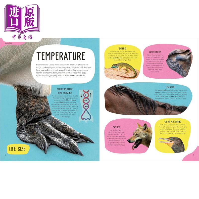 从鲸鱼巨大的心脏和猫头鹰灵敏的耳朵,到乌龟坚硬的外壳和昆虫不寻常的眼睛,详细探索 40 多种动物适应性。生动的照片与带注释的插图相结合,揭示了每个物种的内部情况,彩色图表有助于帮助儿童理解动物解剖学。