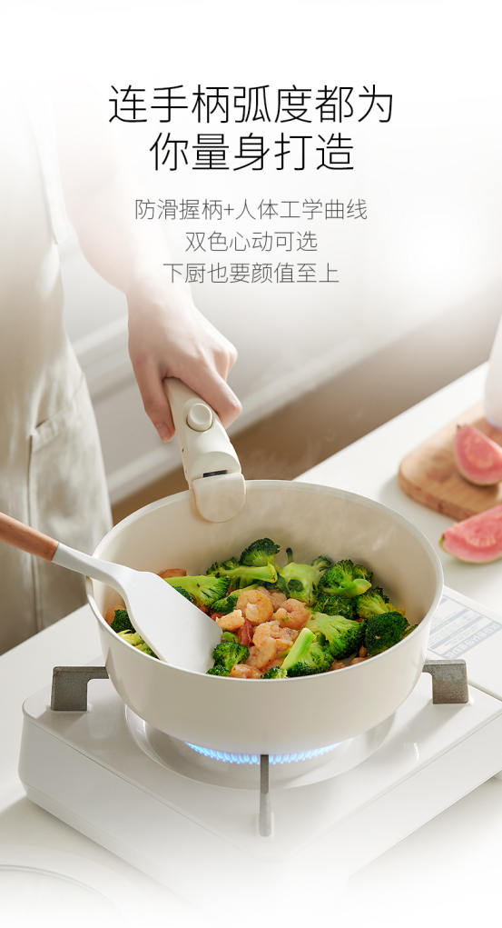 简约防烫手柄,按压拆卸,轻松操作,叠放收纳不占空间; 食品级高纯铝锅体基材,拥有最适合烹饪的导热性能,厚底薄壁轻材料, 高效将温度迅速传至整个锅身,避免局部高温焦糊; 高强度复合底结构,加热更快更均匀,打造低碳节能新生活; 高强度钢化玻璃加硅胶圈组合盖设计,密封性能好,持久耐用,烹饪过程一目了然;