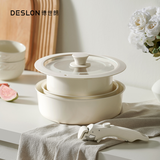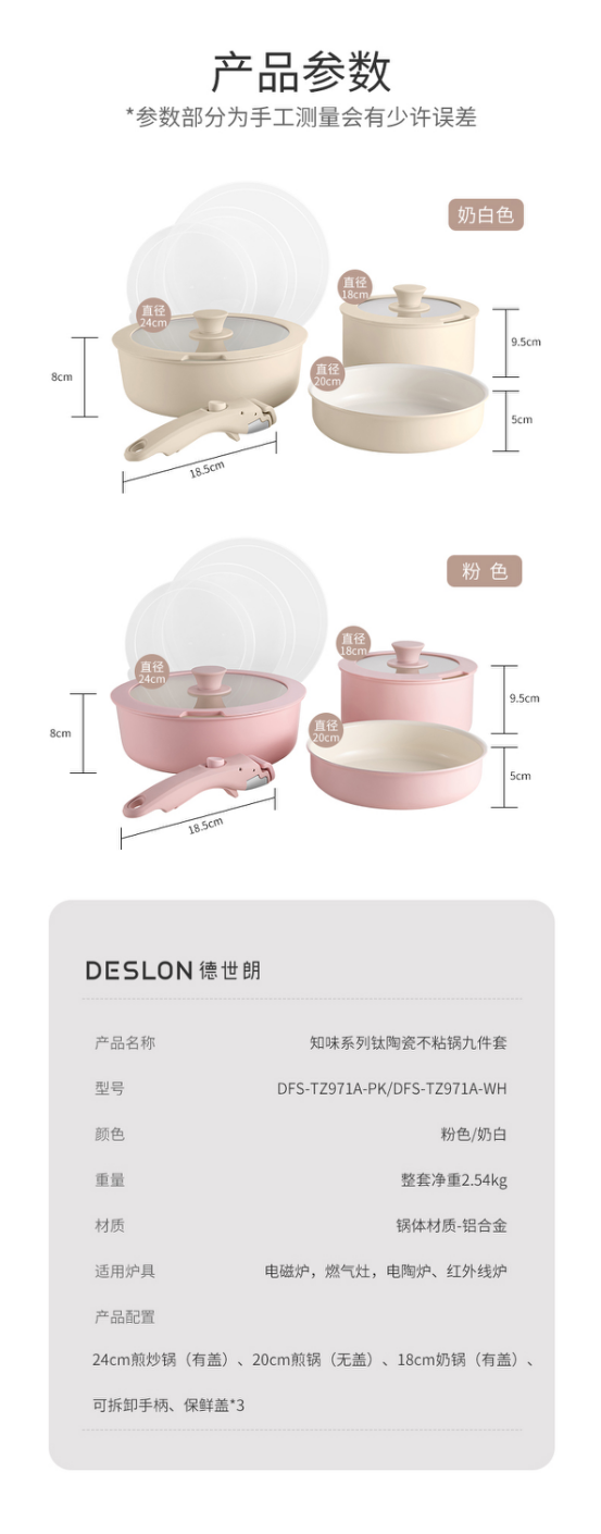 🔥【DESLON德世朗知味系列钛陶瓷不粘锅九件套】🌟 钛金属增强技术,钛陶瓷,健康材质新标杆🌟简约防烫手柄,🥰按压拆卸,轻松操作,叠放收纳不占空间; 粉色/白色两种可选♨️