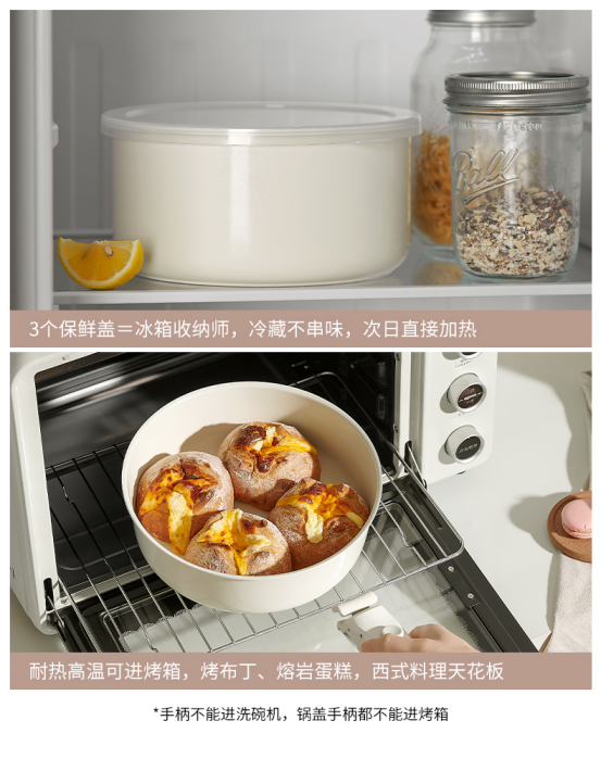 钛金属增强技术,钛陶瓷,健康材质新标杆 陶瓷涂层源于天然无机物,0氟0脱落0分解; 既是锅又是盘,直接端上餐桌,及时吃到食物最新鲜的味道; 搭配密封保鲜盖,食物锁鲜也在行。