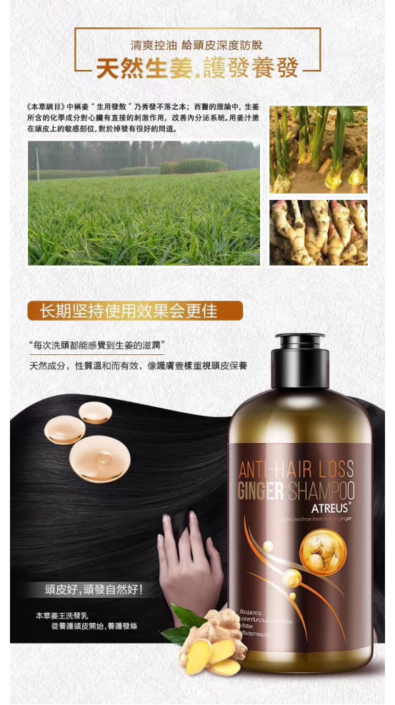 泰国正品Atreus防脱无硅油控油生姜洗发水,姜汁止痒防脱,滋养发根,去头屑,大容量全家用。采用草本植物精粹,没有人工添加剂,无硅油加生姜精华和椰油,拒绝对头皮造成二次伤害,让毛囊保持健康状态,让头发牢牢长在头顶,并且会越长越多噢。