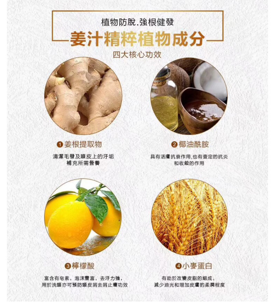 四大植物成分:姜根提取物、椰油酰胺、柠檬酸、小麦蛋白———固发防脱,止痒控油去屑️多功效