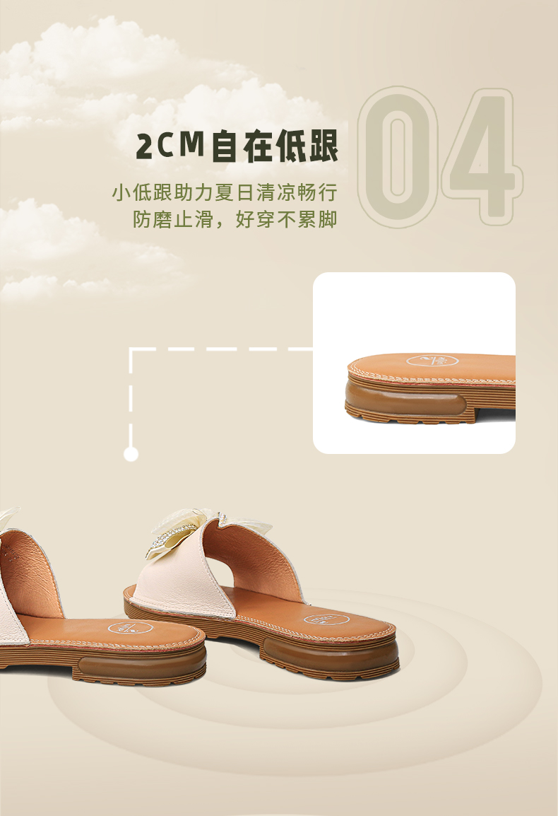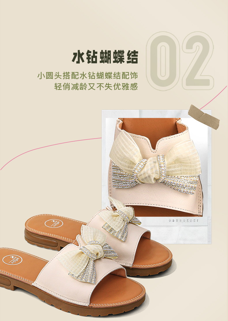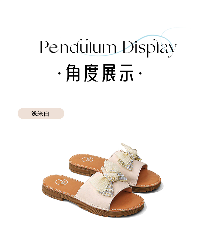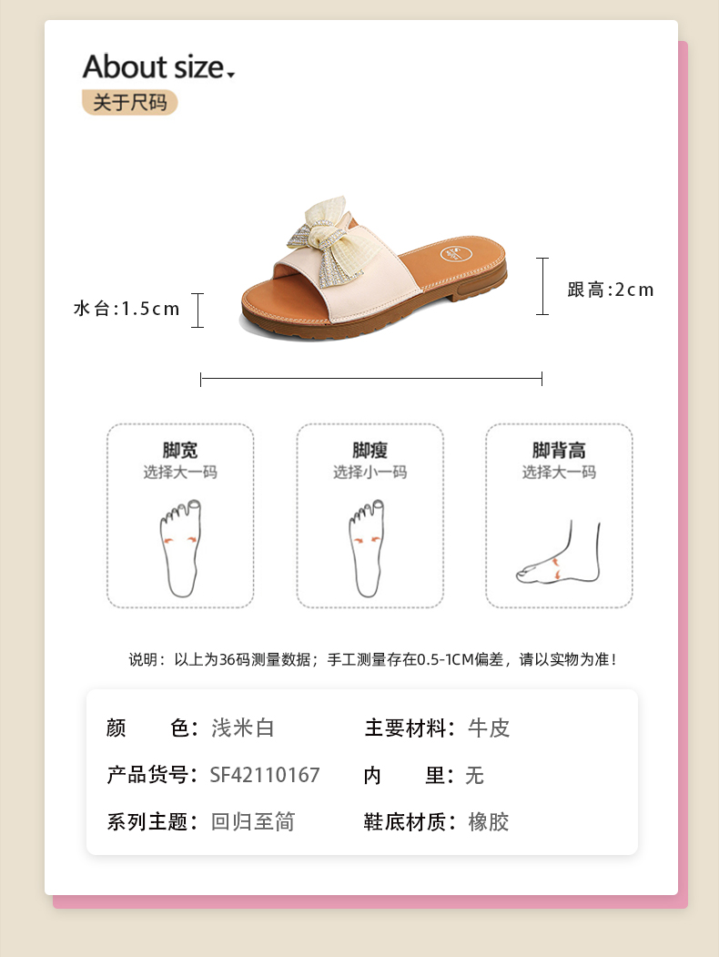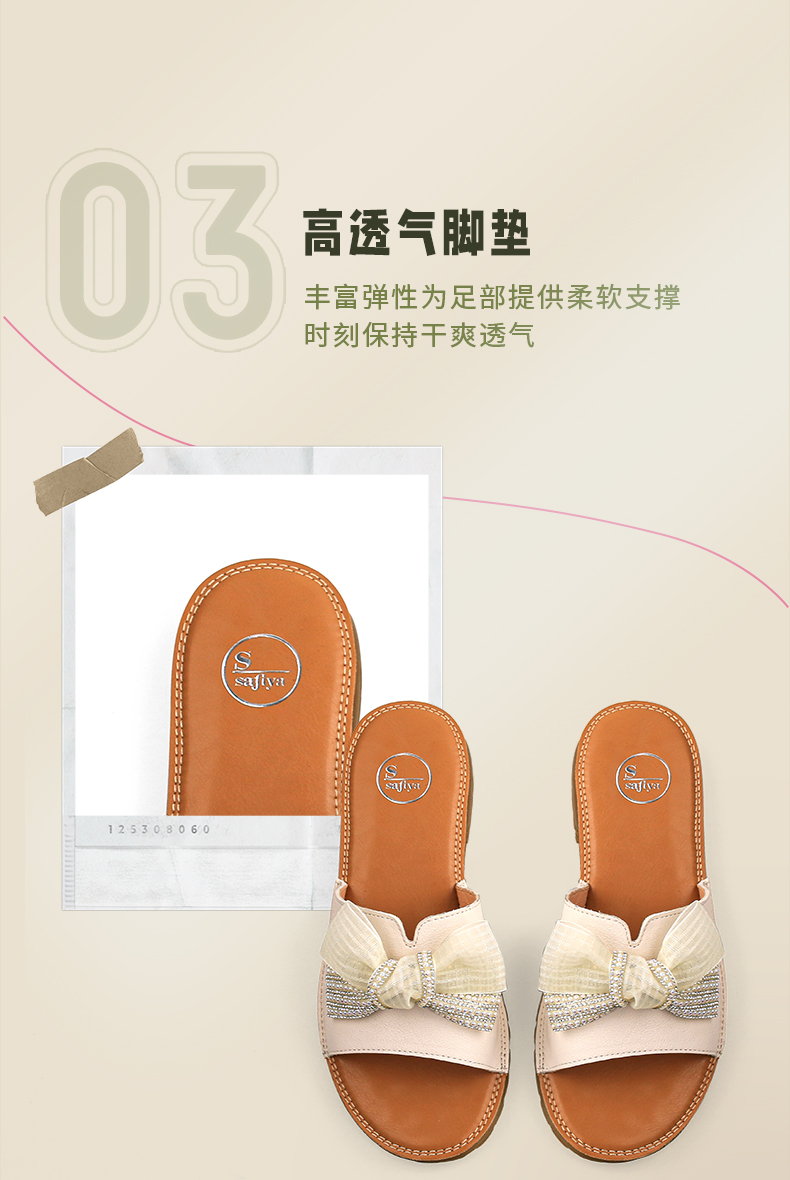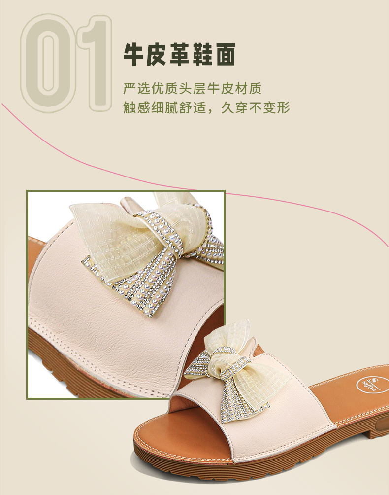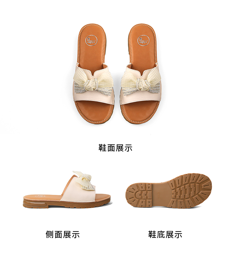 Safiya/索菲娅2024夏季真皮水钻蝴蝶结外穿休闲平底沙滩拖鞋 SF42110167
