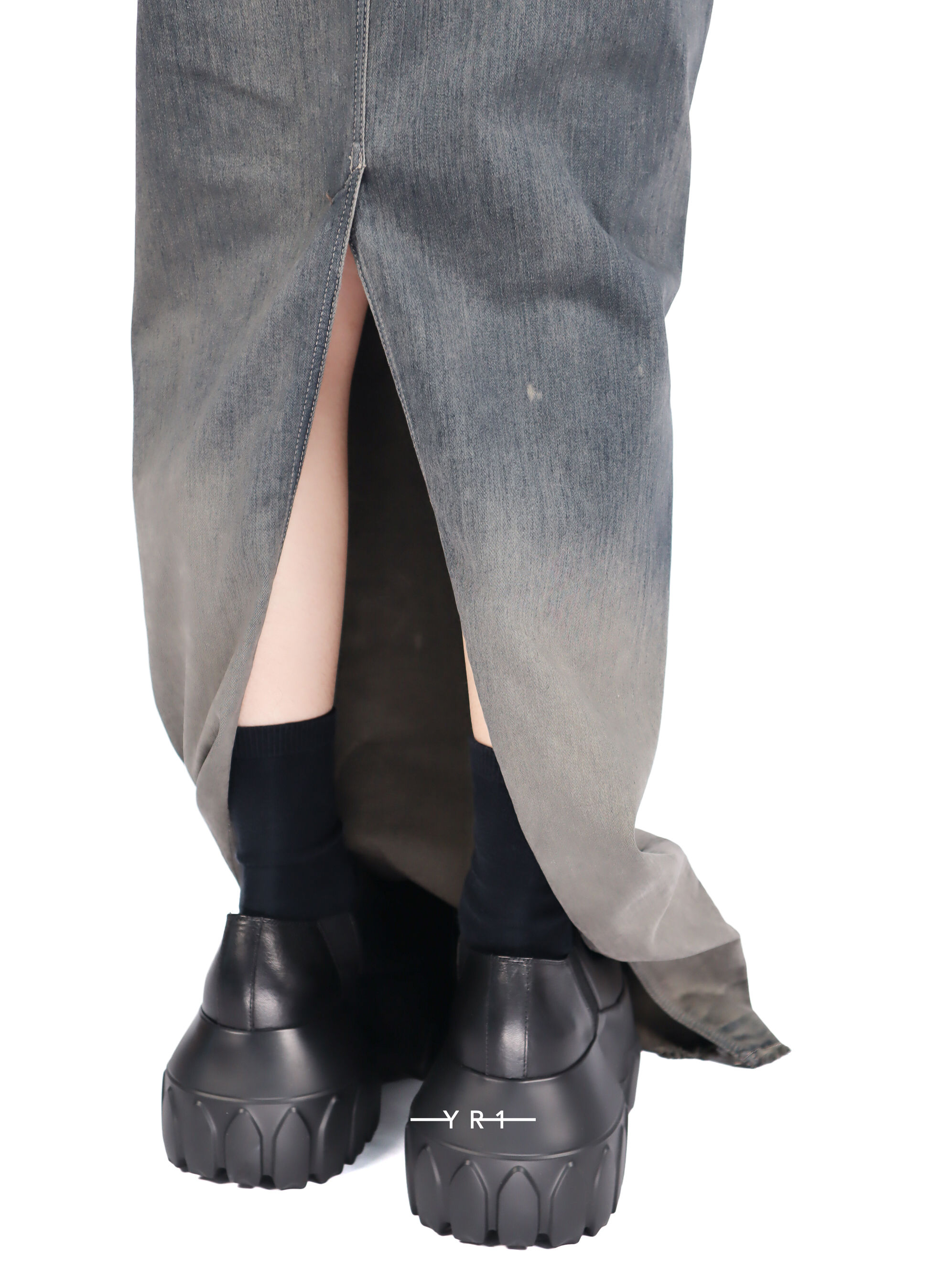 裙摆贴合身形,略微收至脚踝处,背部中央有开叉设计
