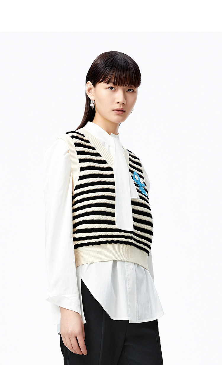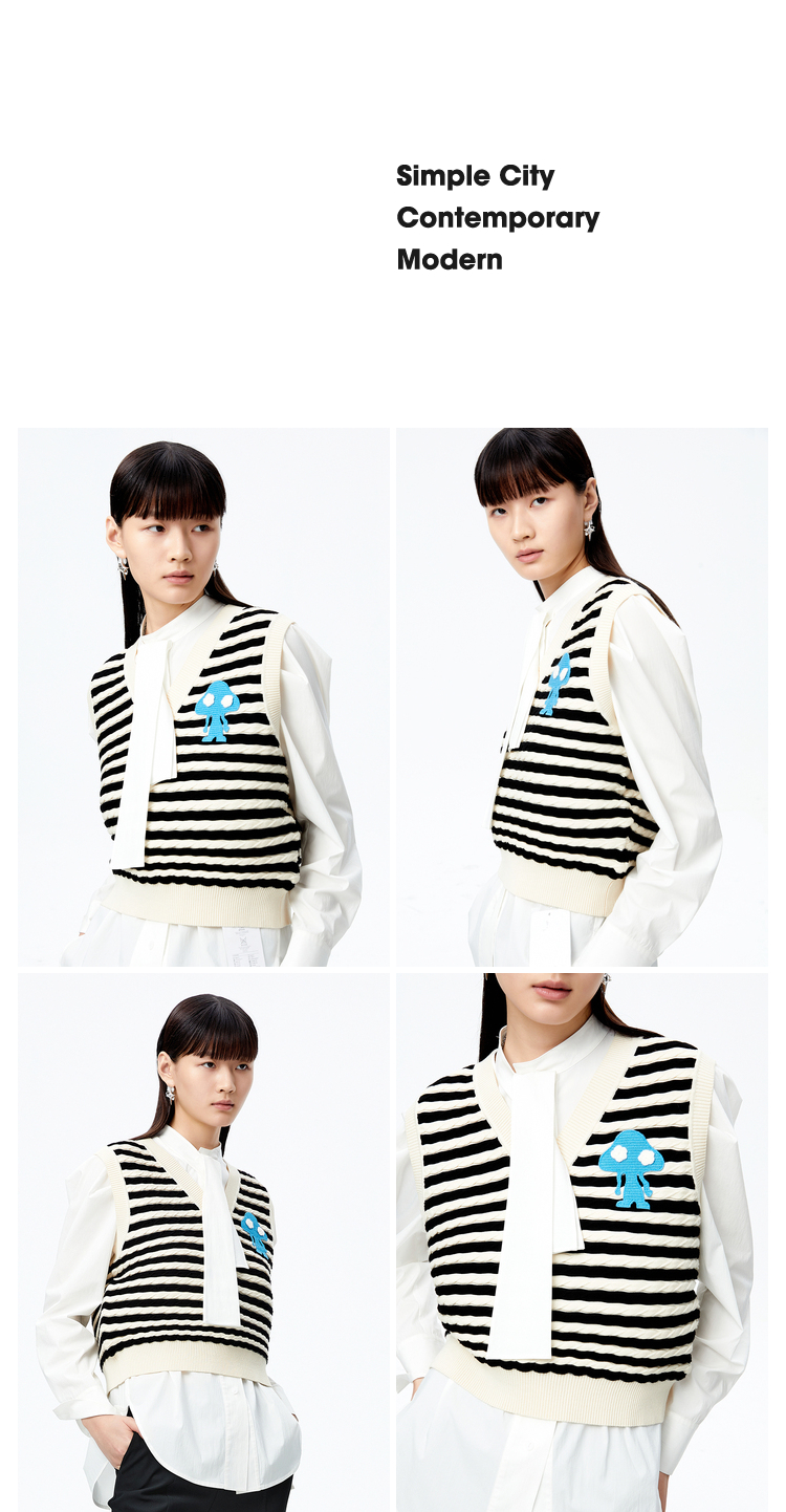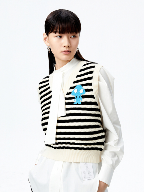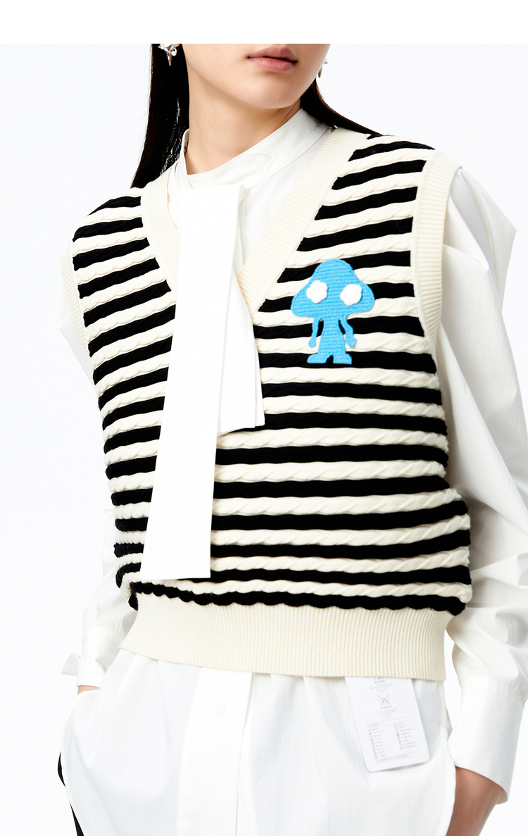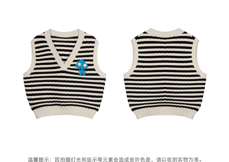 NEELLY纳俪商场同款条纹马甲女气质V领卡通刺绣修身针织衫马夹潮N22083A01101
