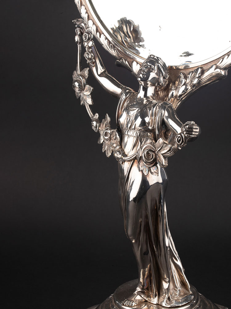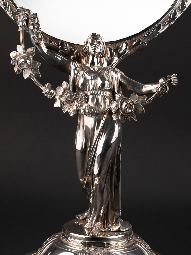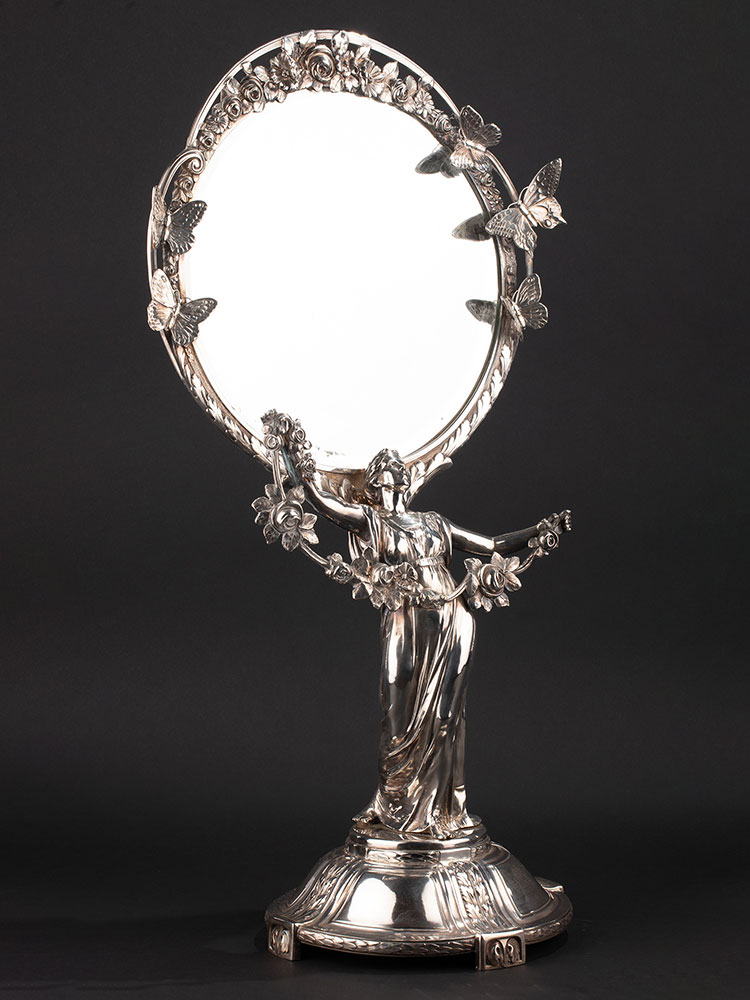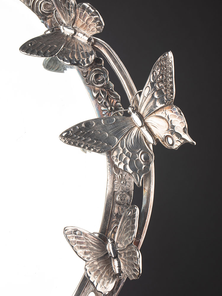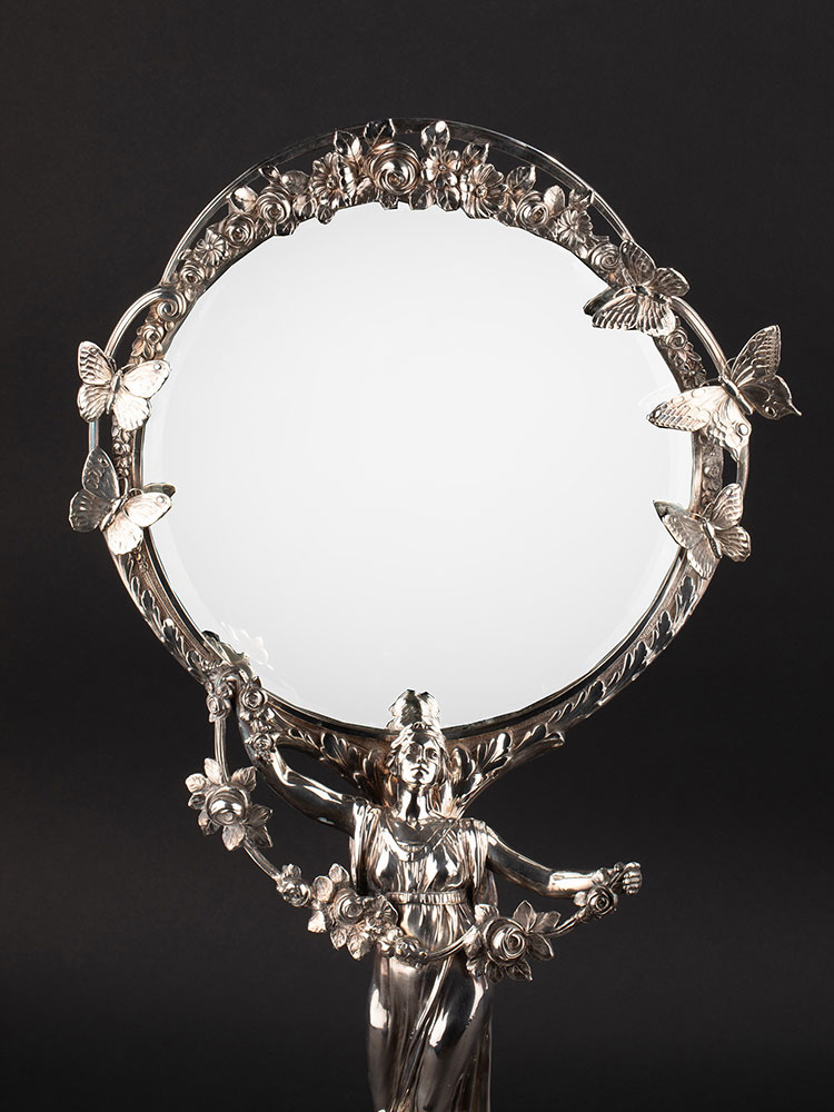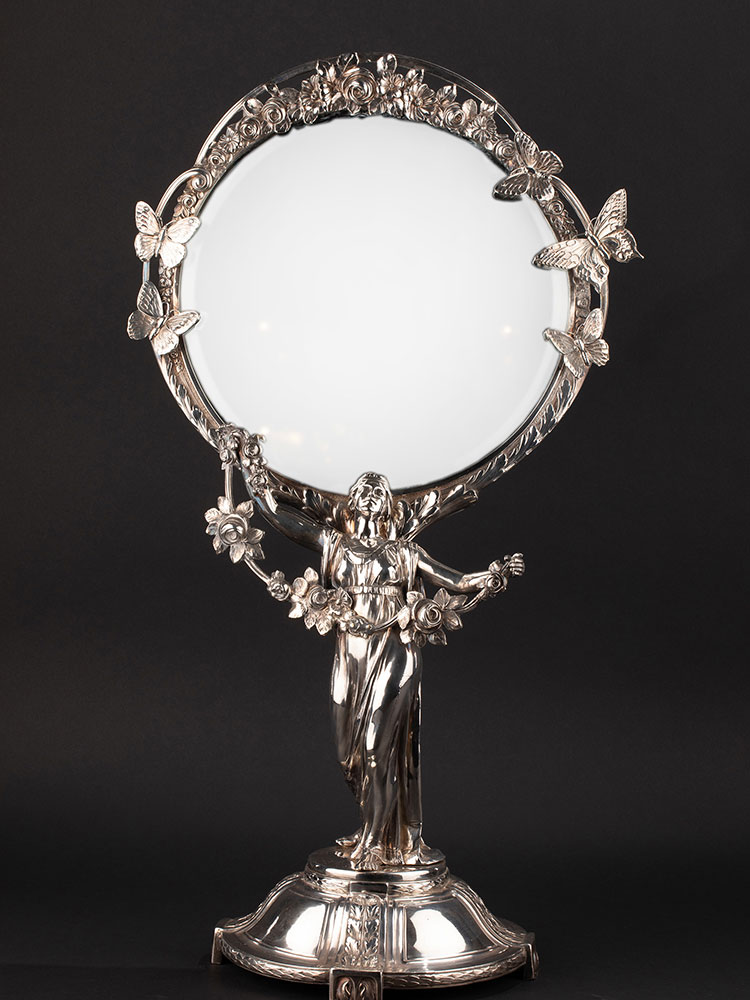 1900年代欧洲出品新艺术风格蝴蝶与少女主题铜镀银梳妆镜