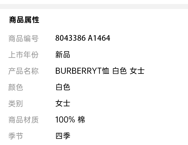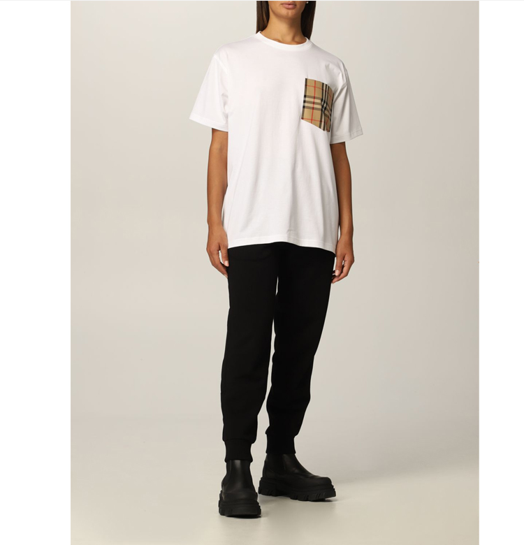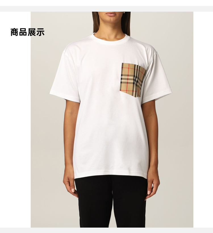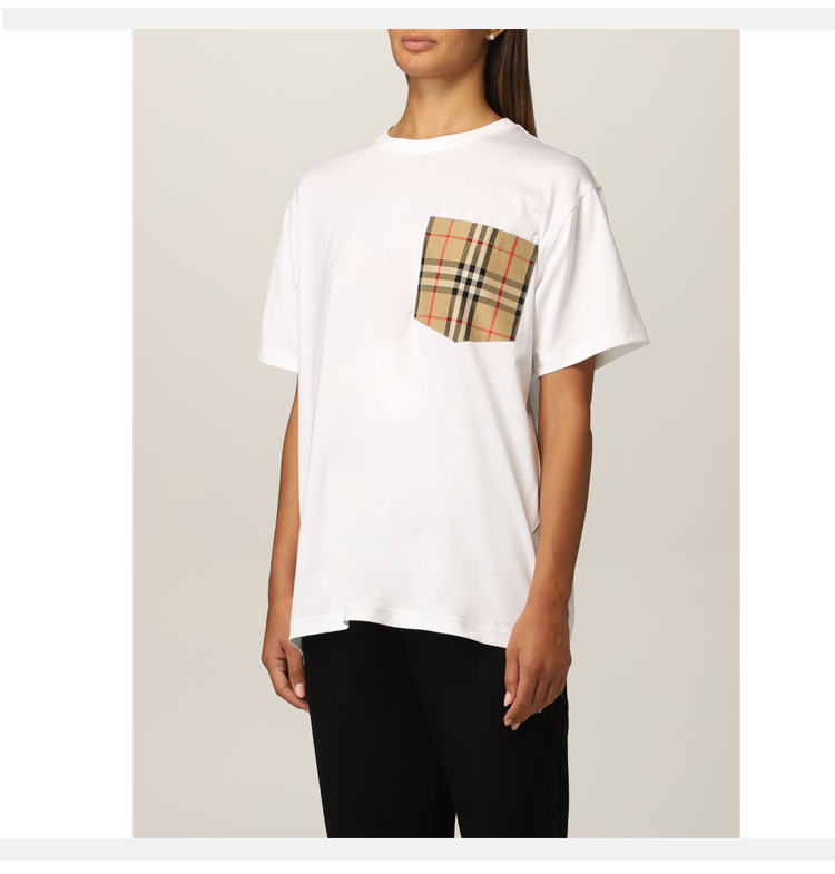 【一】BURBERRY 巴宝莉 女士 Vintage 格纹口袋棉质宽松圆领短袖T恤 白色 8043386 A1464