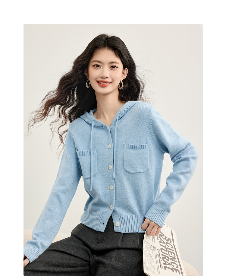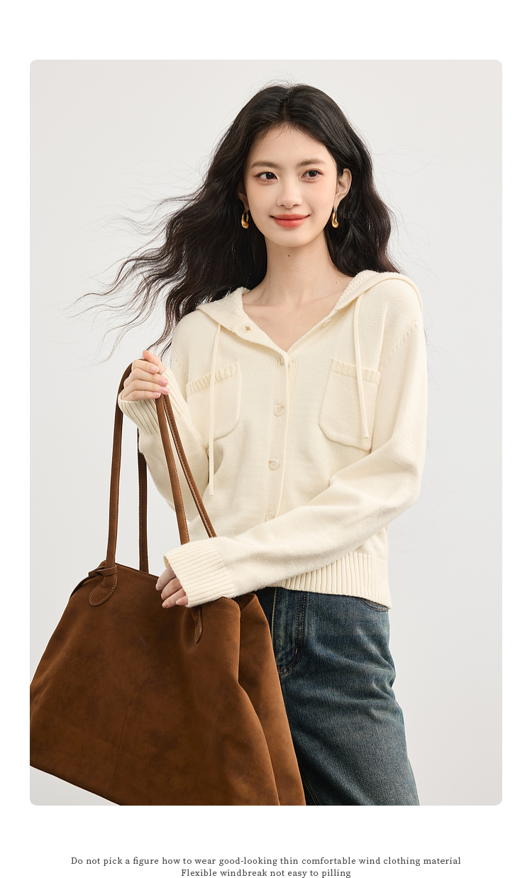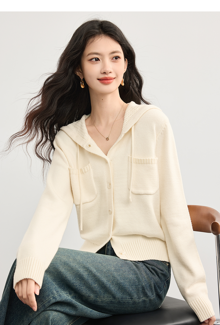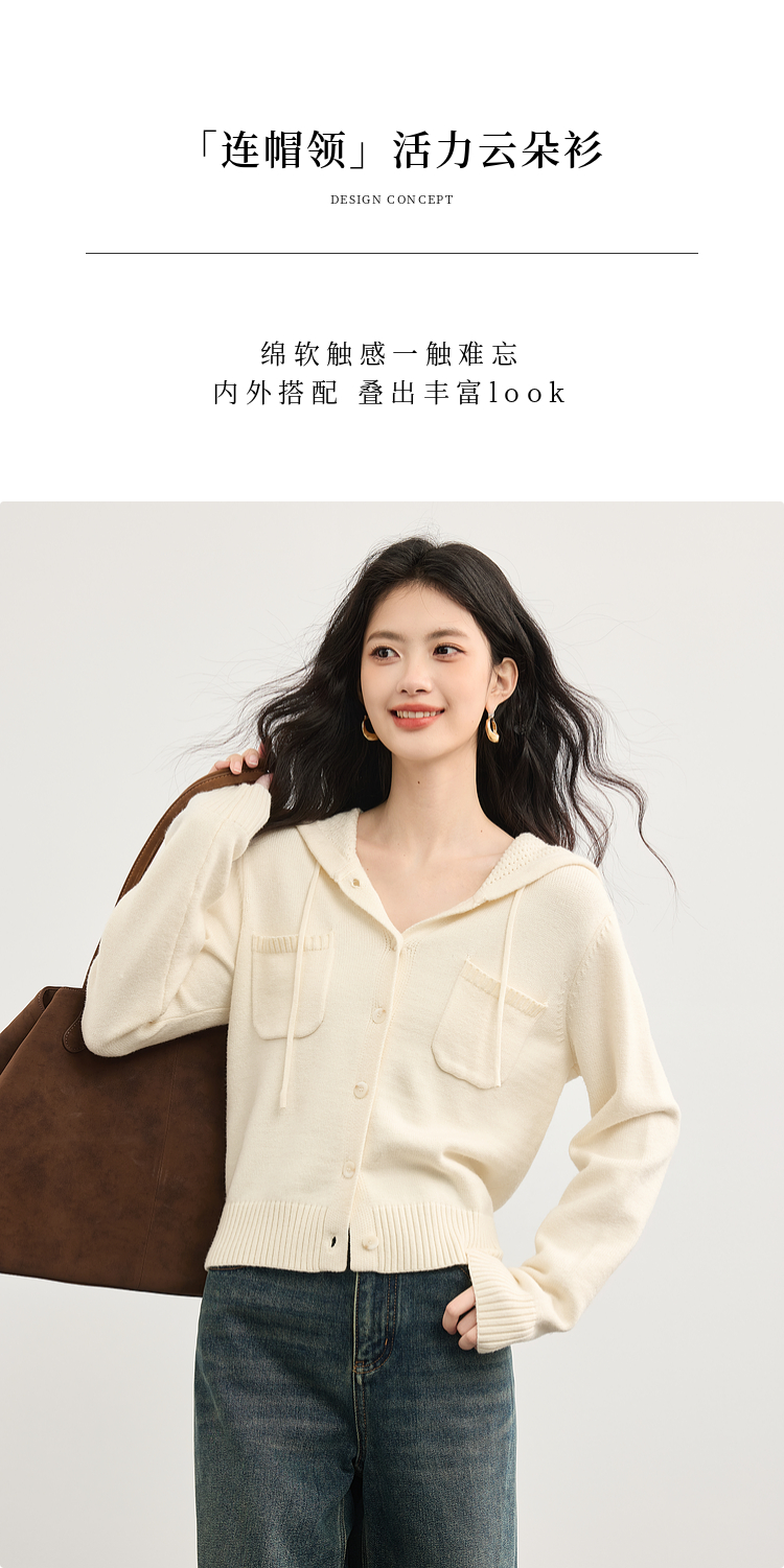 【09/17新品】熙世界云朵氧气感连帽针织开衫女2025秋装新款高弹长袖毛衣短外套