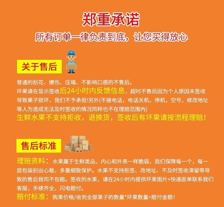 3、生鲜水果非标品众口难调,所有口感不好、品相不好、表皮轻微擦伤、地址不详、电话错误、乡镇地址、超区都不在售后范围。