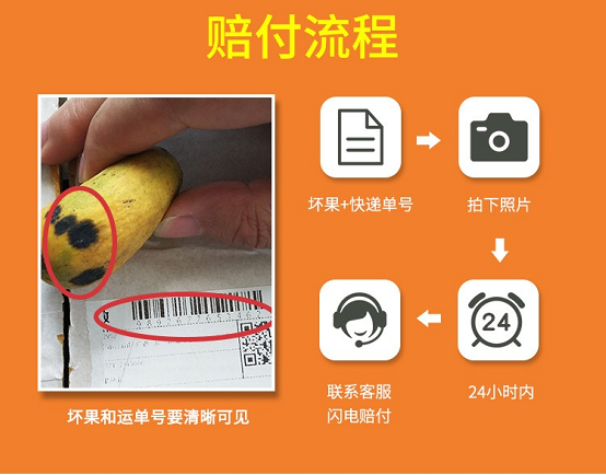 1、拍照要求:签收后24小时内坏果和快递面单一起拍在一张照片联系我们客服处理,必须单号清晰可见!