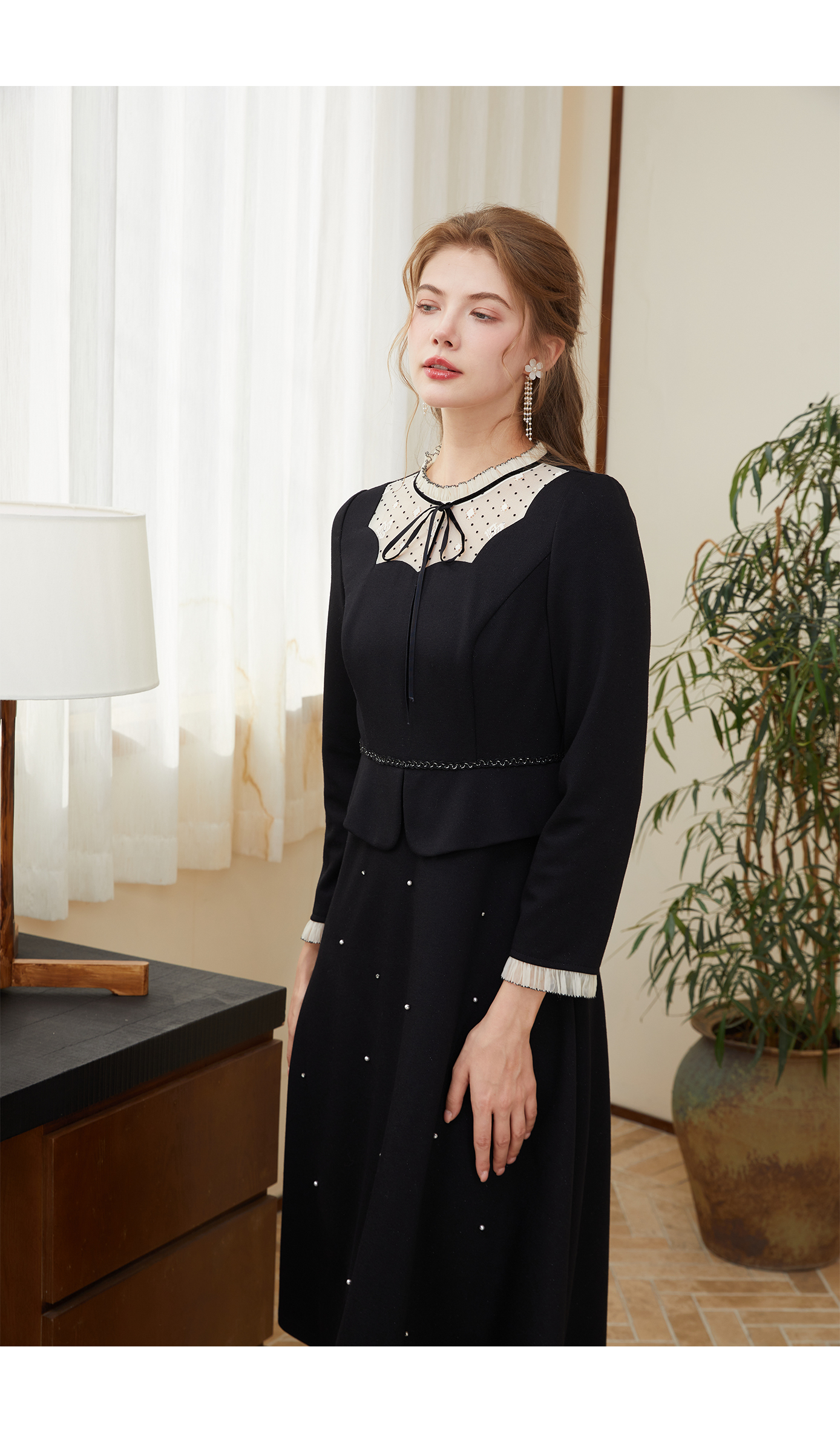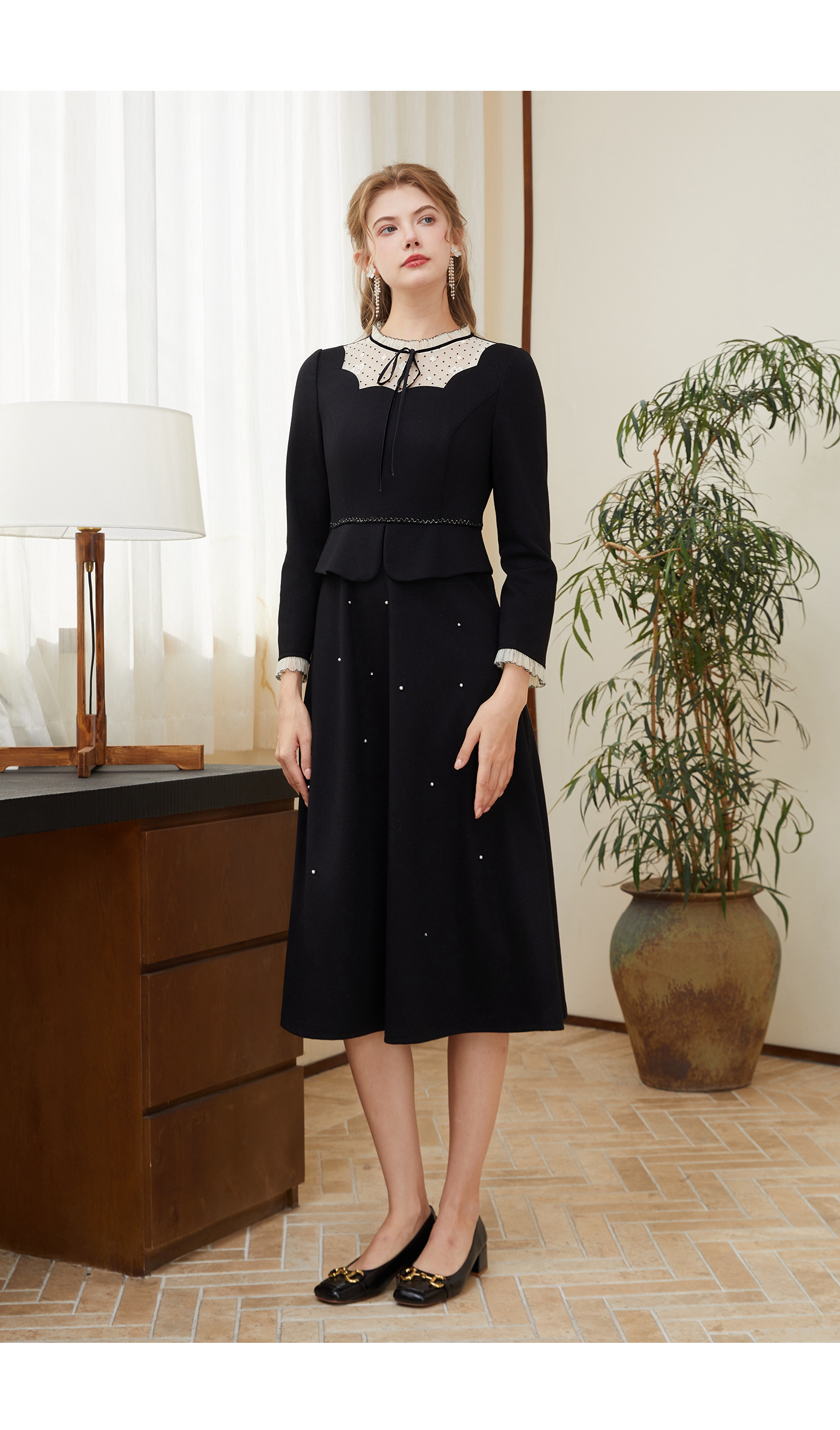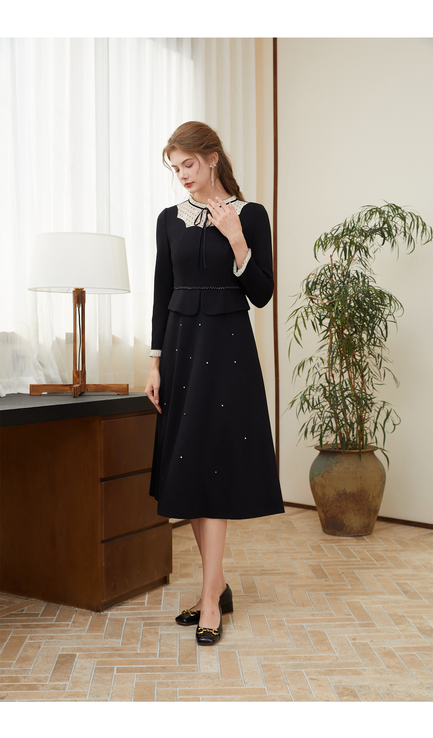 司歌A921151X假两件长袖连衣裙优雅收腰黑裙A921151X