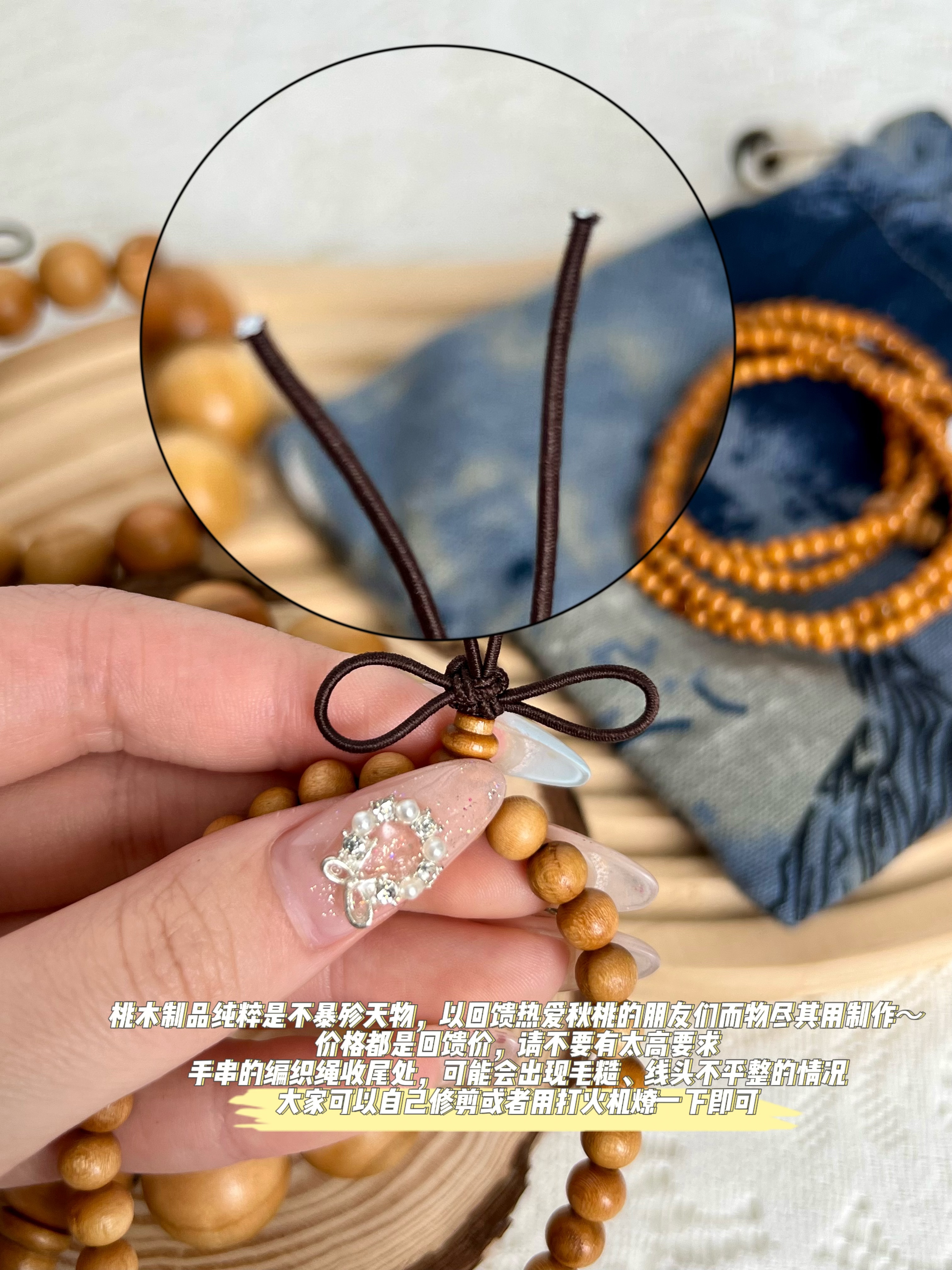 ●桃木制品纯粹是不暴殄天物,以回馈热爱秋桃的朋友们而物尽其用制作,价格都是回馈价,请不要有太高要求,手串的编织绳收尾处,可能会出现毛糙、线头不平整的情况,大家可以自己修剪或者用打火机燎一下即可