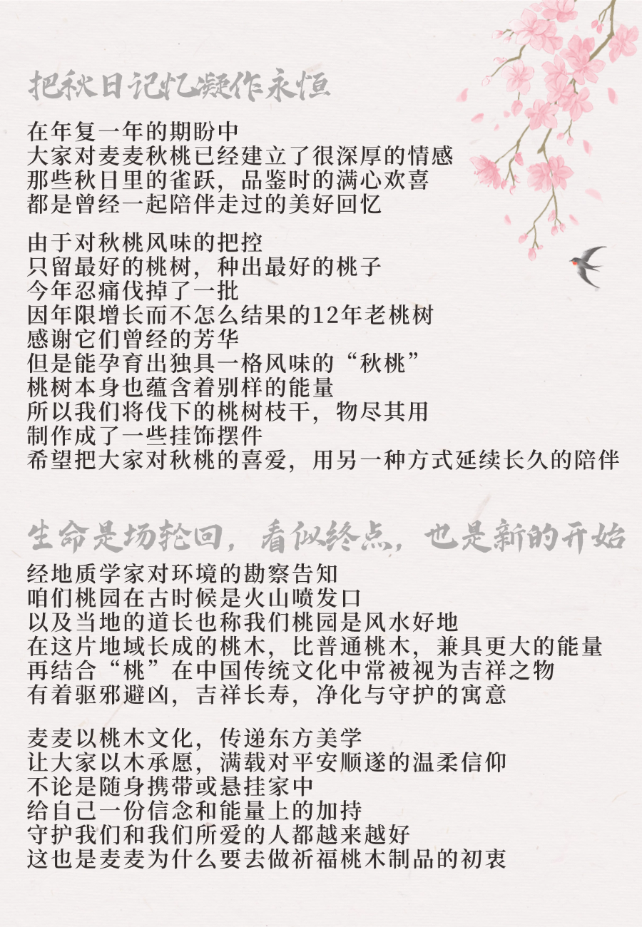最早的一批桃树也已经进入了老树期。老树基本不会长桃子了,伐掉之后的老桃树,我们会陆续出一系列的桃木制品。