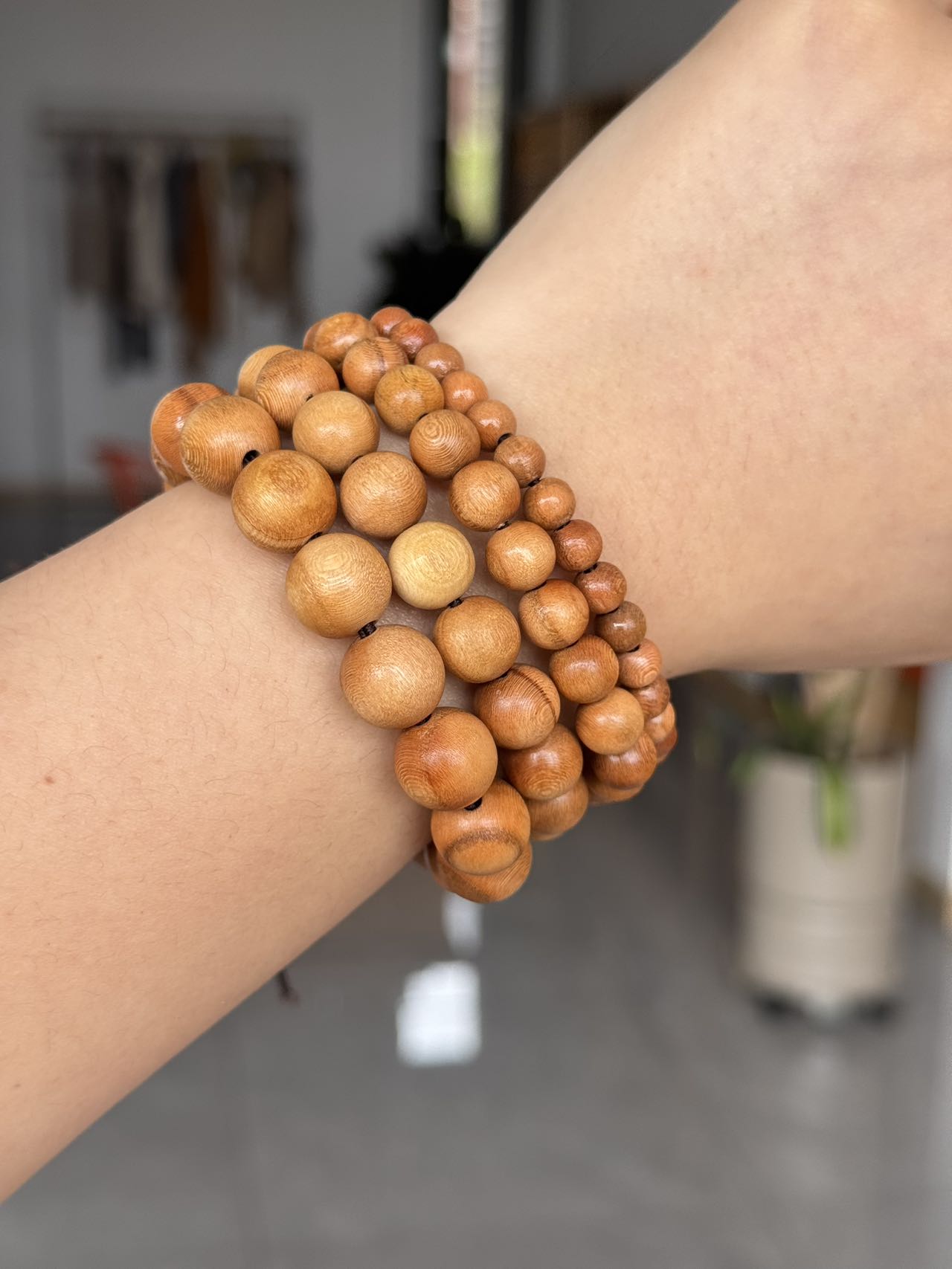 然后我们的手串是做的带漆涂层的,这样外表更美观,用的是环保漆,味道很淡没有影响,如果对气味敏感的朋友,收到货后可以先把手串晾一晾再戴