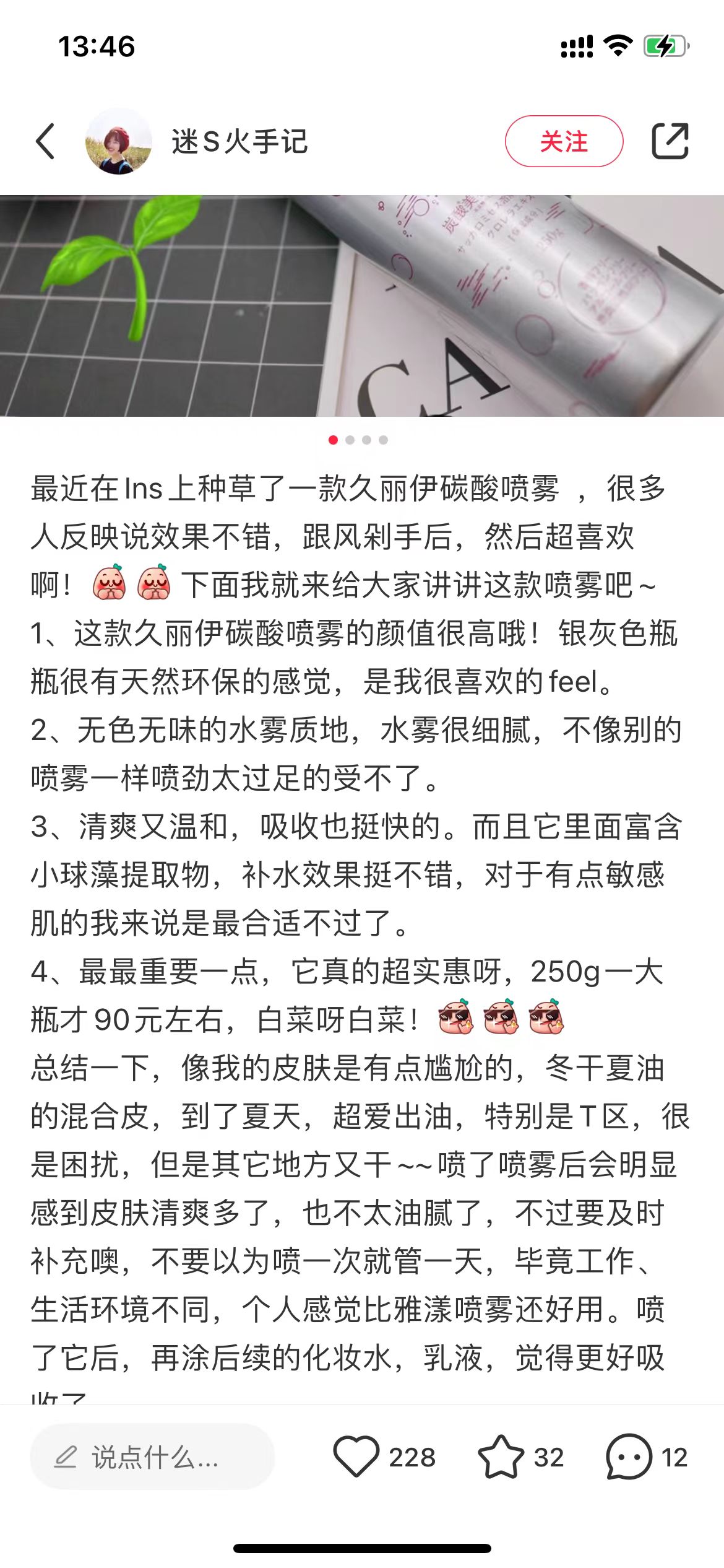 不是简单的一款水喷雾,它是含有植萃成分,补水的同时还可以舒缓肌肤