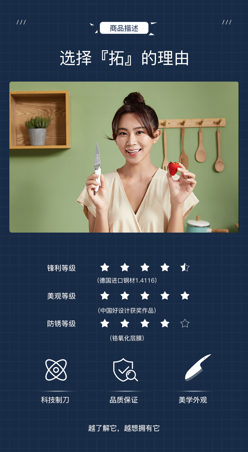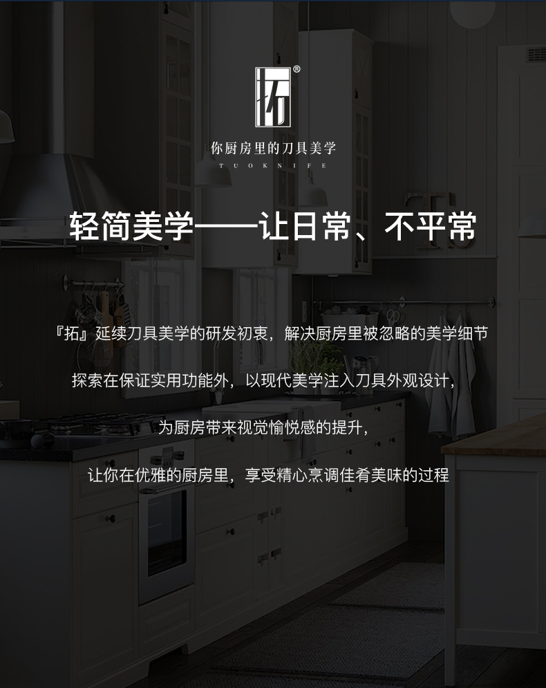 “拓”牌刀具为广东拓必拓科技股份有限公司旗下品牌,一直专注于研究、生产、销售专业厨房刀具,并与欧美、日本、台湾地区等多家知名品牌刀具进行合作,产品行销欧洲、美洲、日本等三十几个国家和地区。