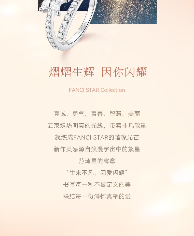 FANCI范琦始于2012年,以珠宝表达内心为初衷,聚焦不同亲密关系情感表达,联结无形情感,以情感符号「I FANCI U」传情达意,诠释“恋爱戴范琦,起点是你,终点亦是你”始终如一的恋爱价值观。