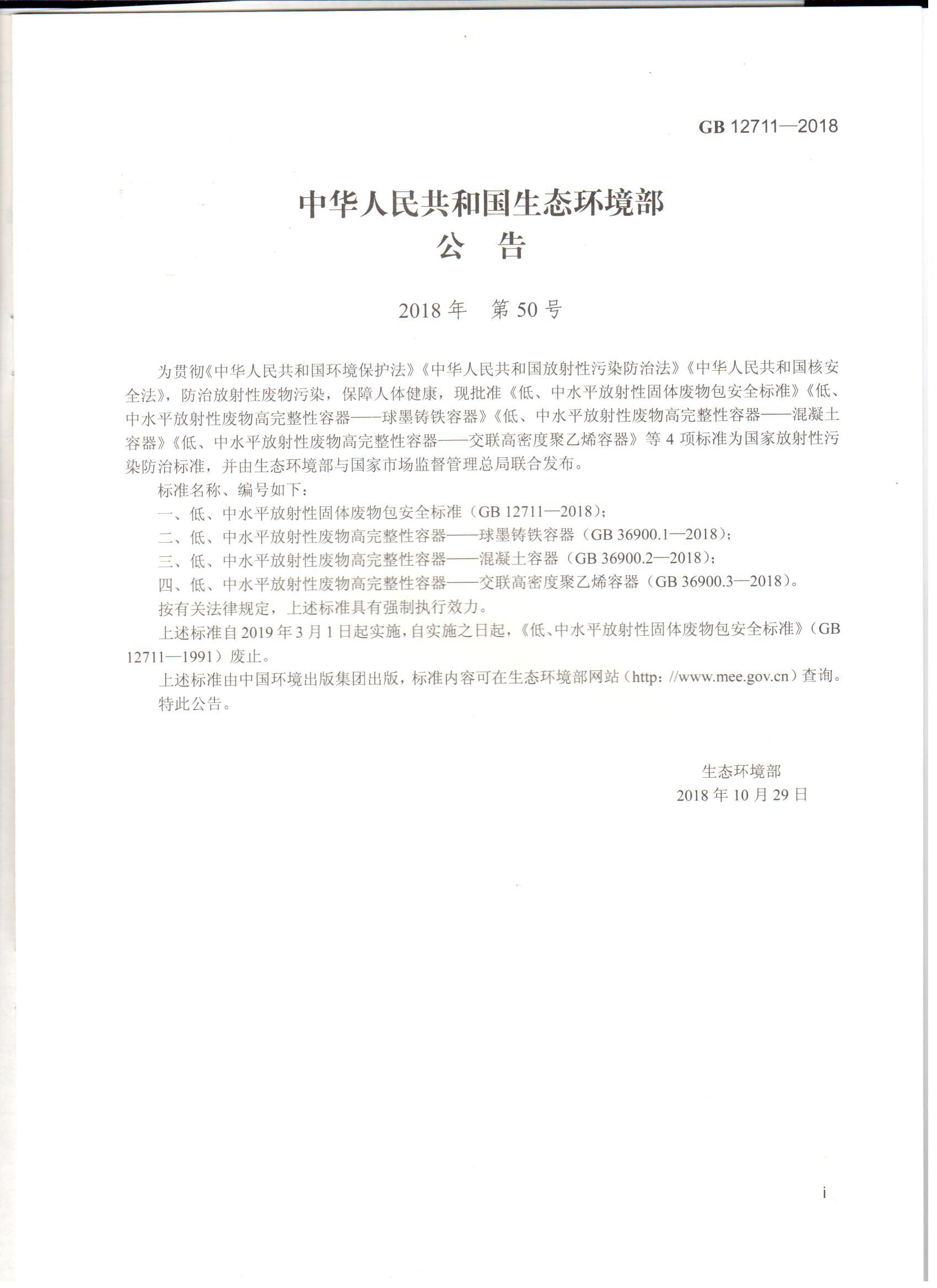 GB12711-2018 低、中水平放射性固体废物包安全标准 国家标准 135111715