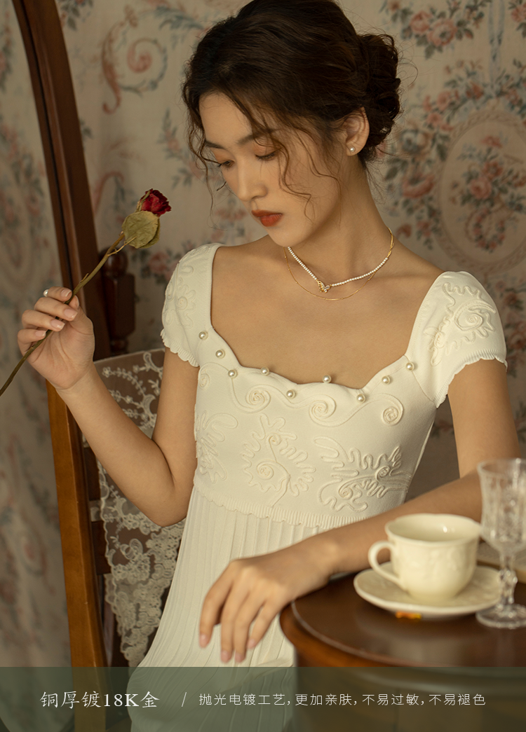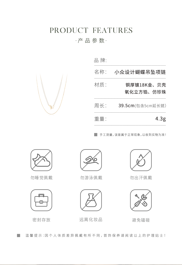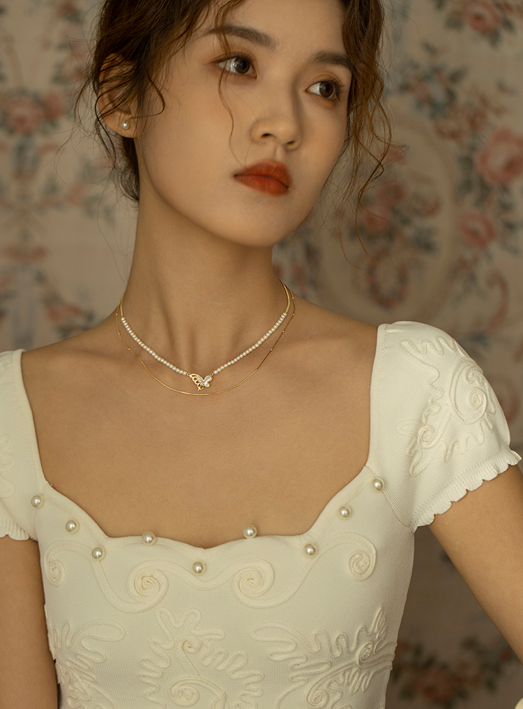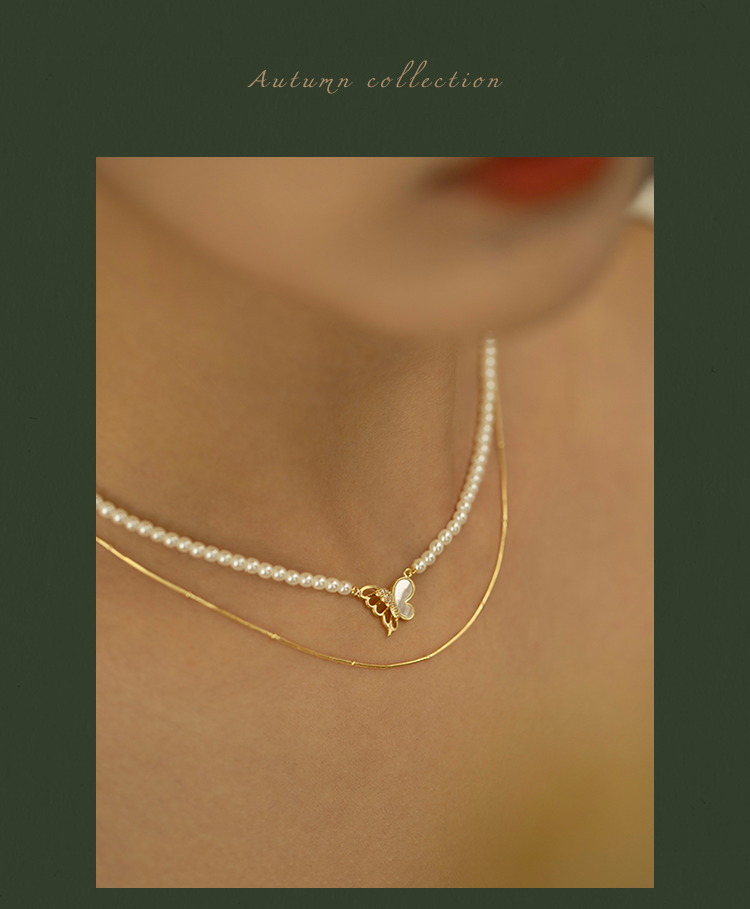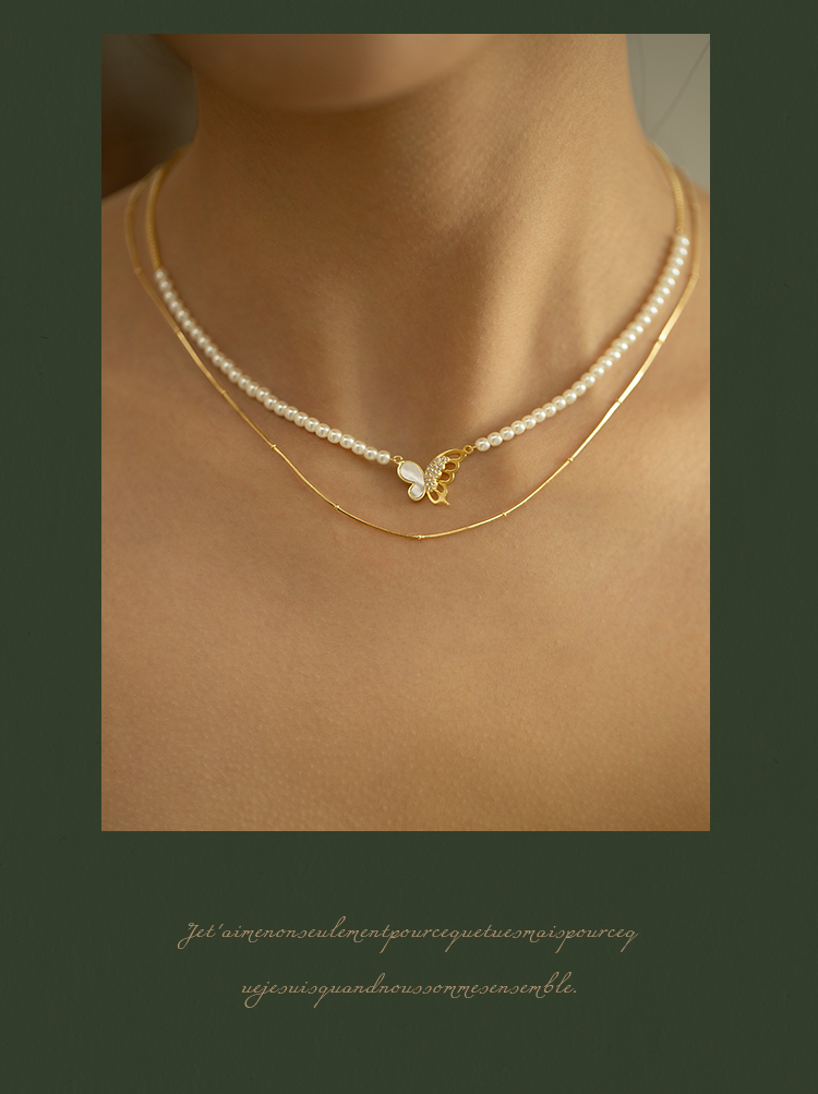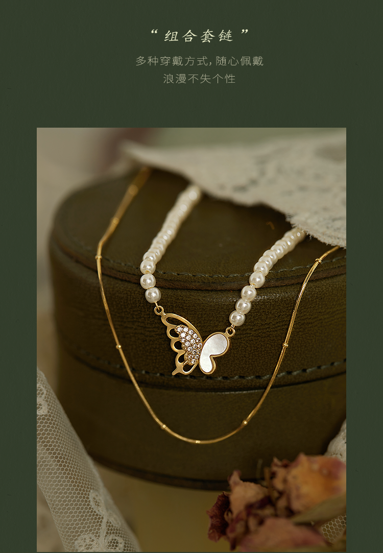 Oflye潮流饰品 微镶满钻贝壳蝴蝶项链女小众设计叠戴人造珍珠