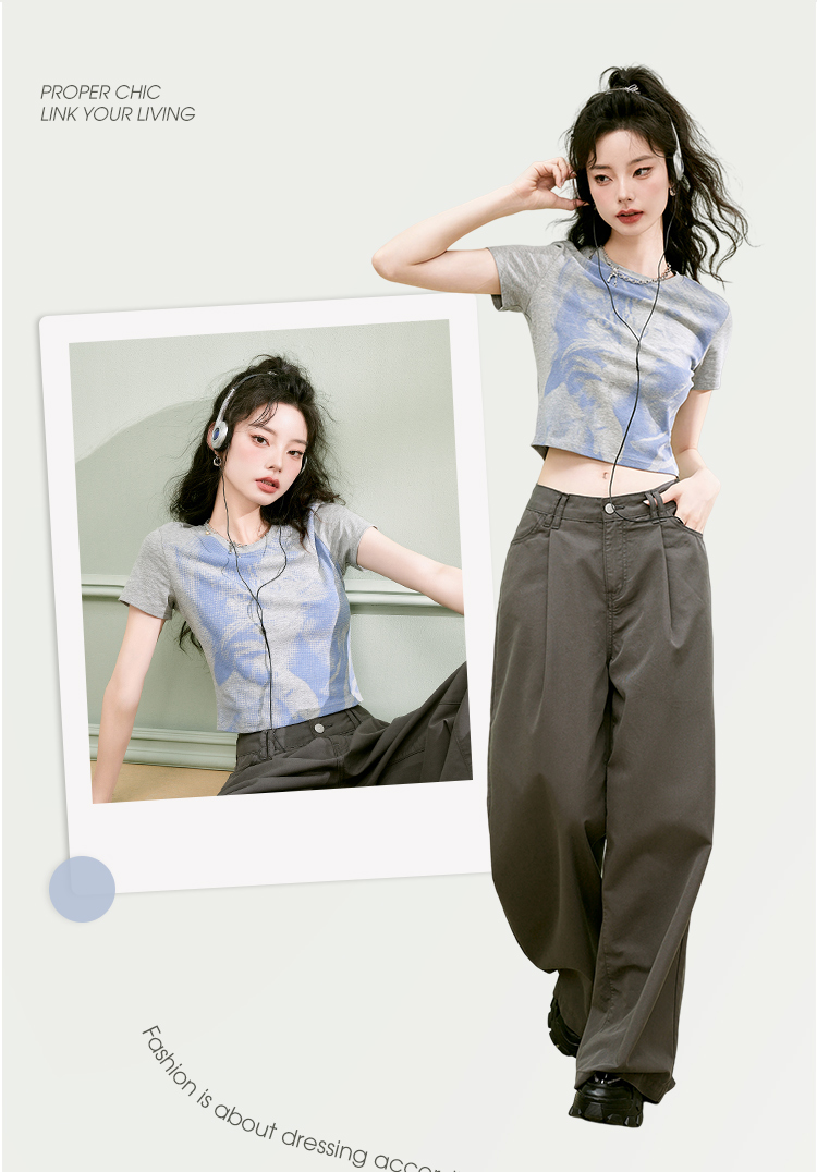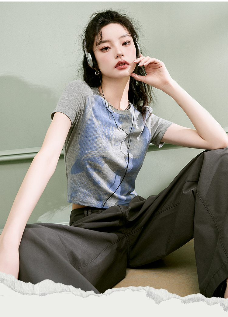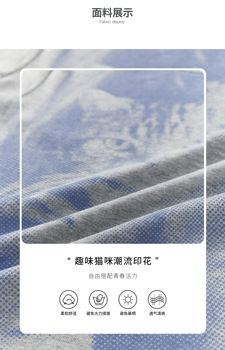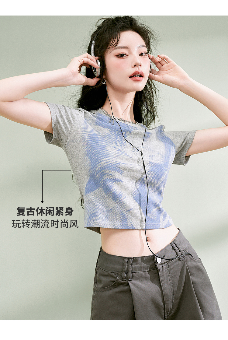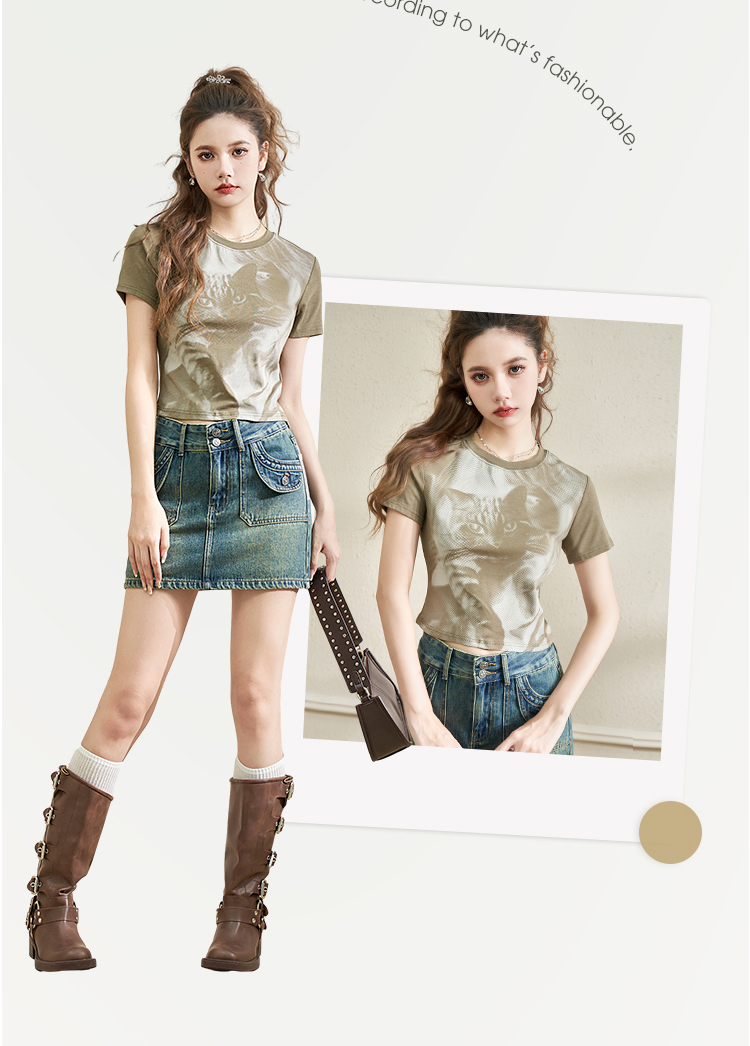 西遇趣味猫咪印花T恤女新款圆领短袖小个子辣妹上衣D1531873